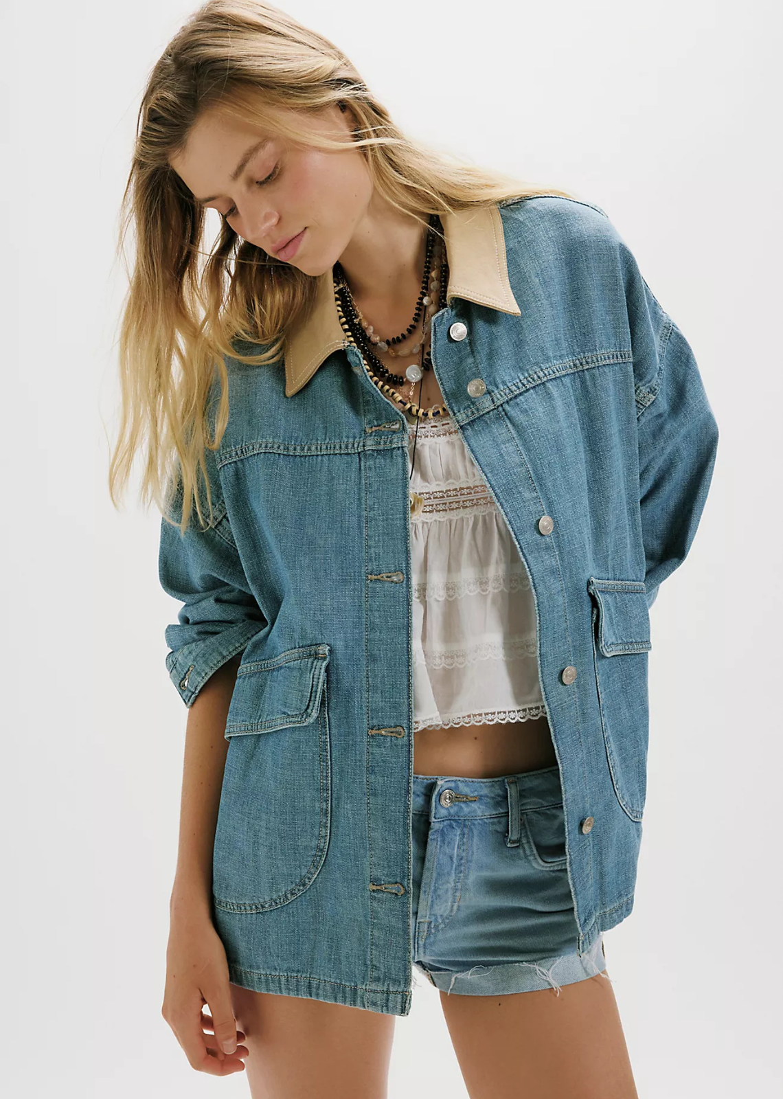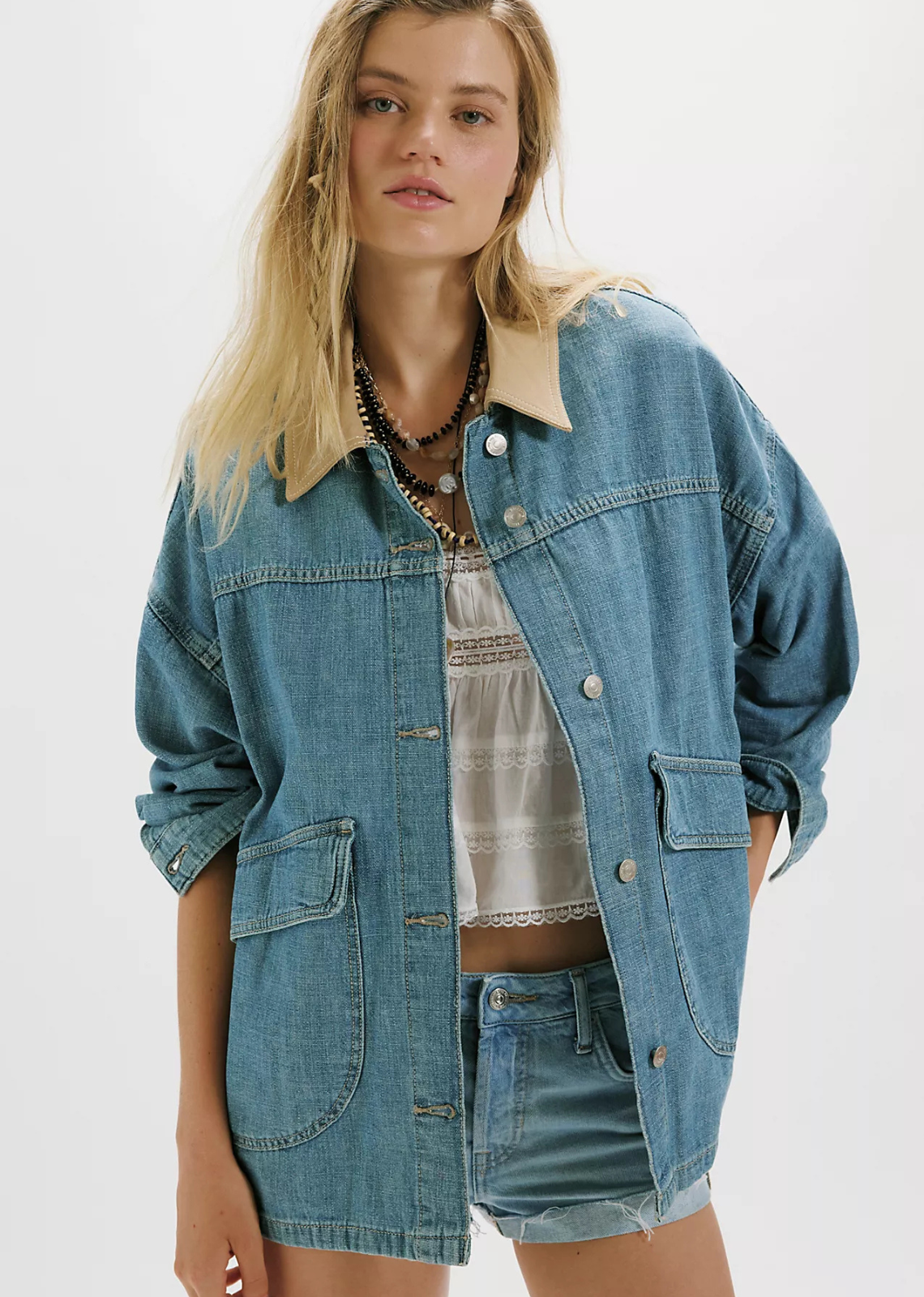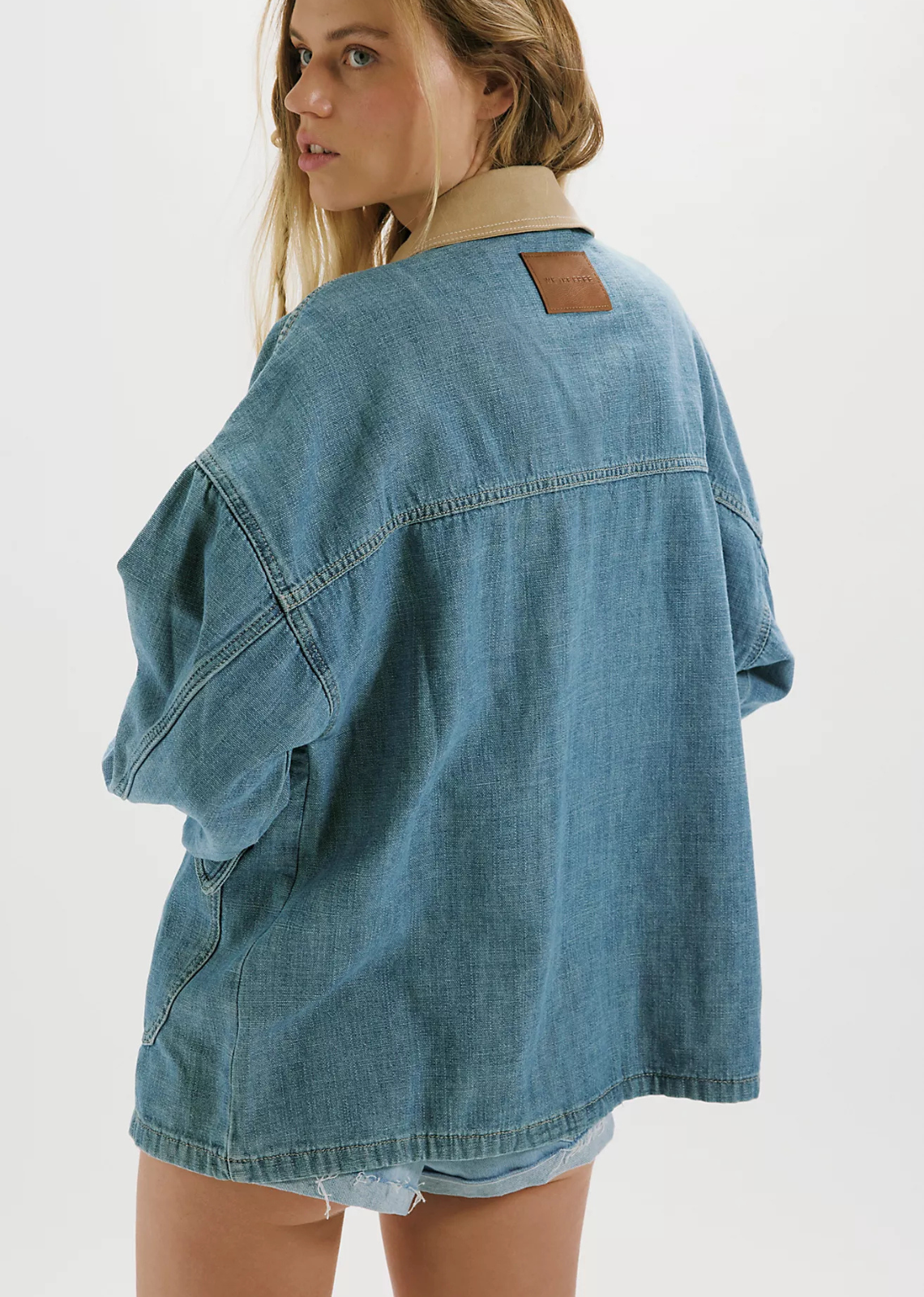 Perfectly oversized, this staple denim jacket features asymmetrical pockets and a contrasting canvas collar for subtle details that truly make the piece.