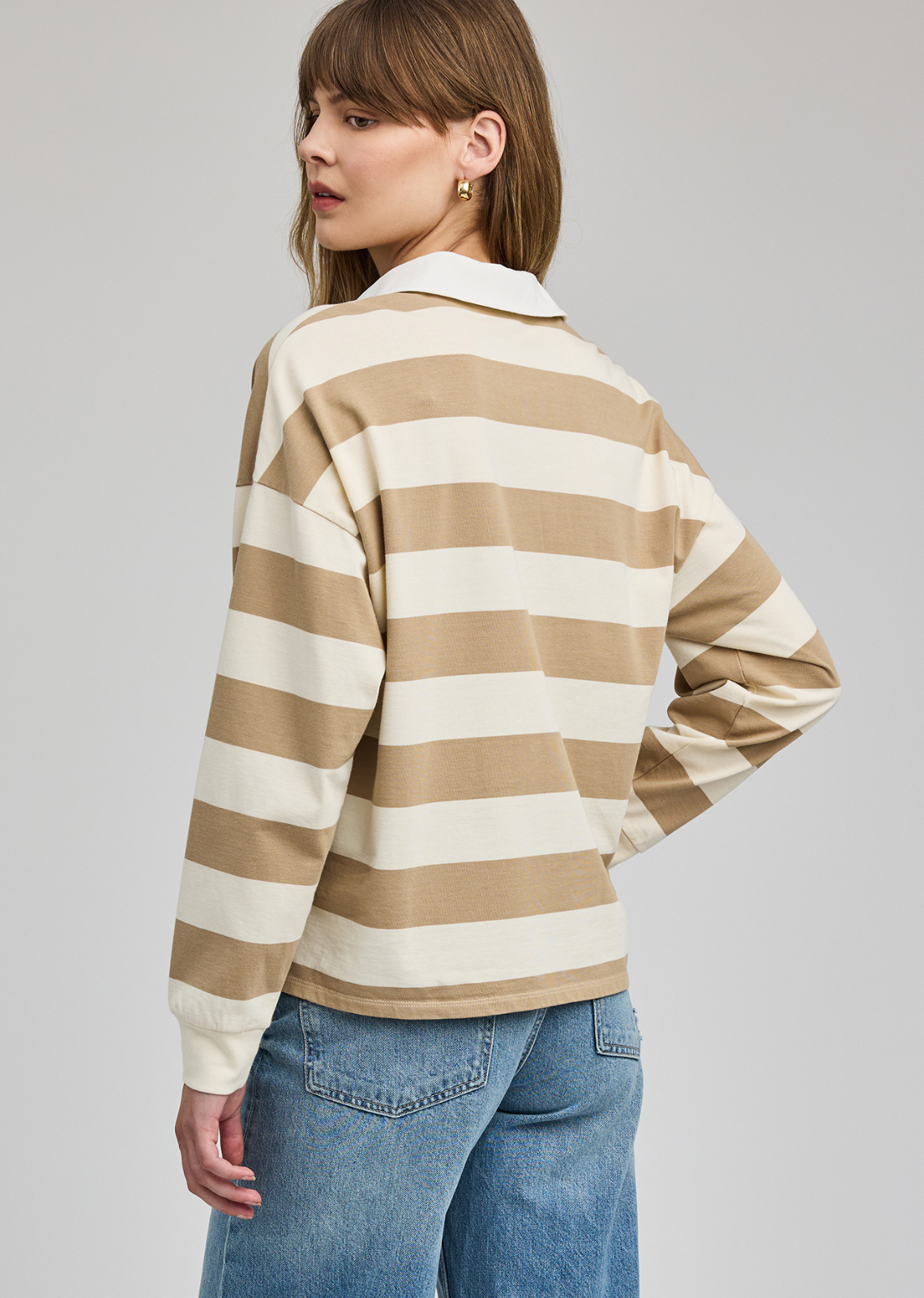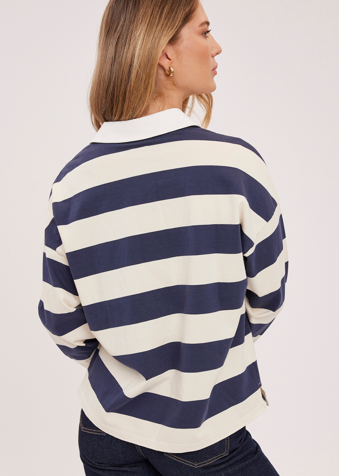 The Britt shirt is made of a cotton jersey with a classic rugby stripe. Features include a contrast collar, half placket button closure, and side slits.