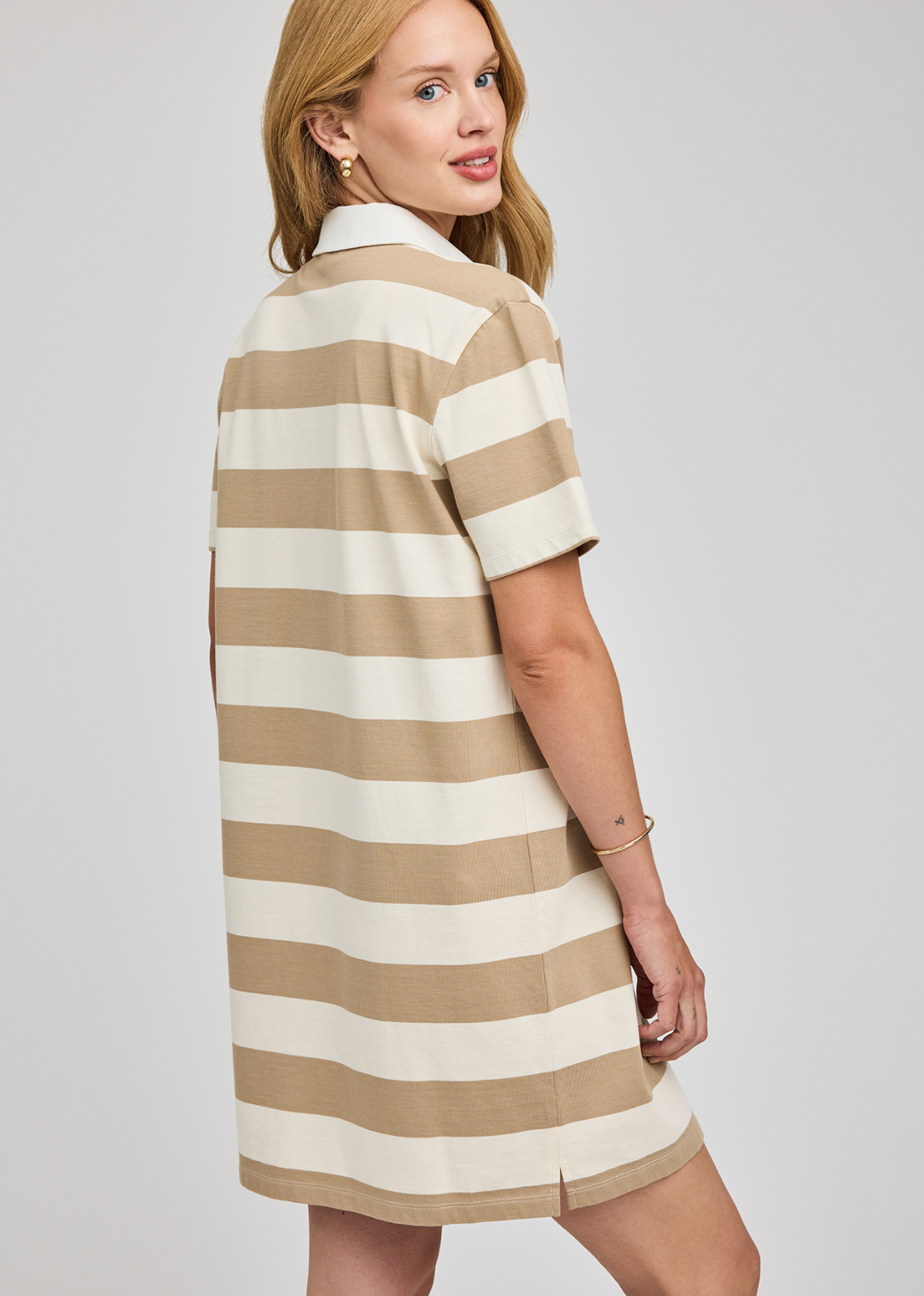 The Colbie dress is made of a cotton jersey with a classic rugby stripe. Features include a contrast collar, half placket button closure, and side slits.