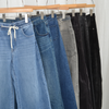 HIGH RISE STRETCH WIDE JEAN FEATURING FRONT MINI PATCH POCKETS DETAILED WITH WHISKERS AND A WIDE HEM IN WASHED BLACK