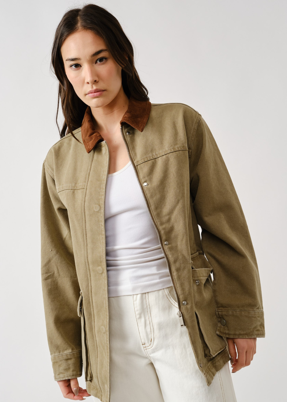 Description: This casual jacket features a relaxed fit, high neckline, and full-zip front. With dropped shoulders, elastic cuffs, and drawstring hem, it offers stylish comfort...