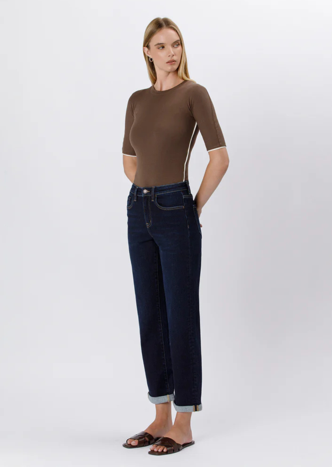 Description: Crafted from comfort stretch denim, these Time Away jeans elevate your look with a high rise waist and double cuff hem. With a cropped...