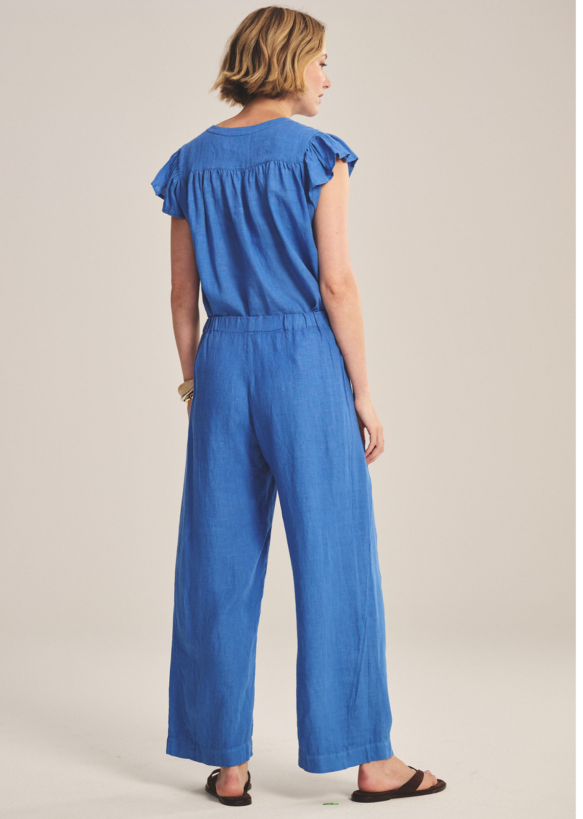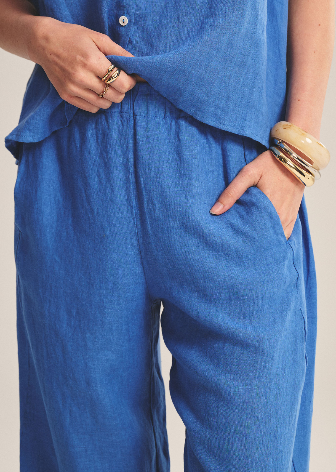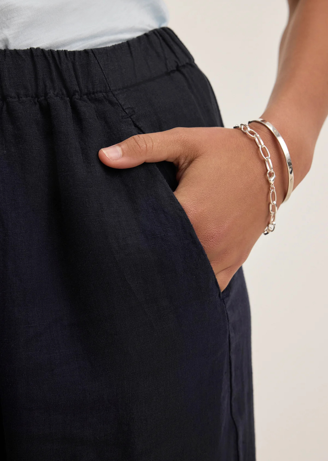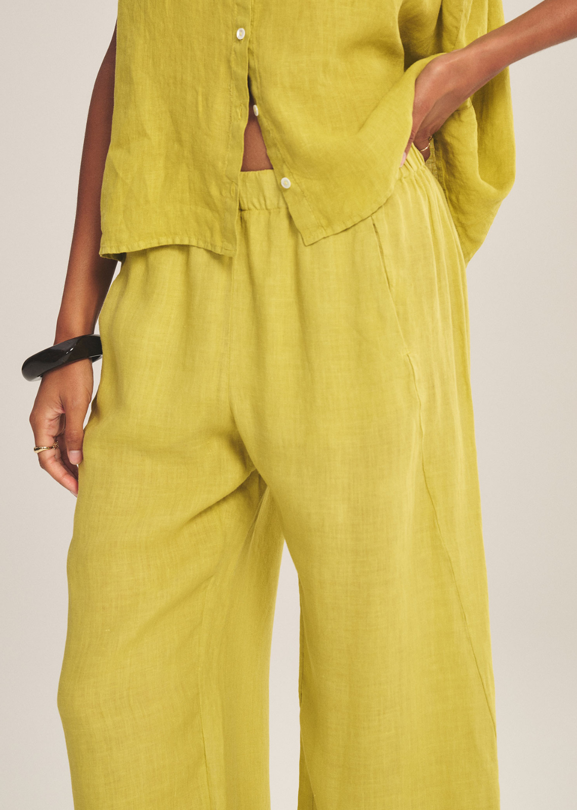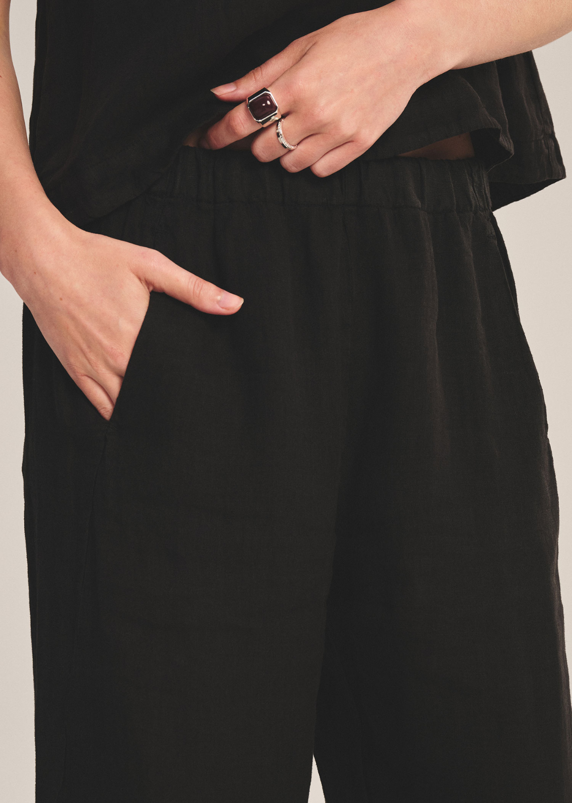 Description: The perfect pant. Crafted from a lightweight linen woven, these pull-on trousers have an elastic waist, a relaxed leg with a slight ankle crop,...
