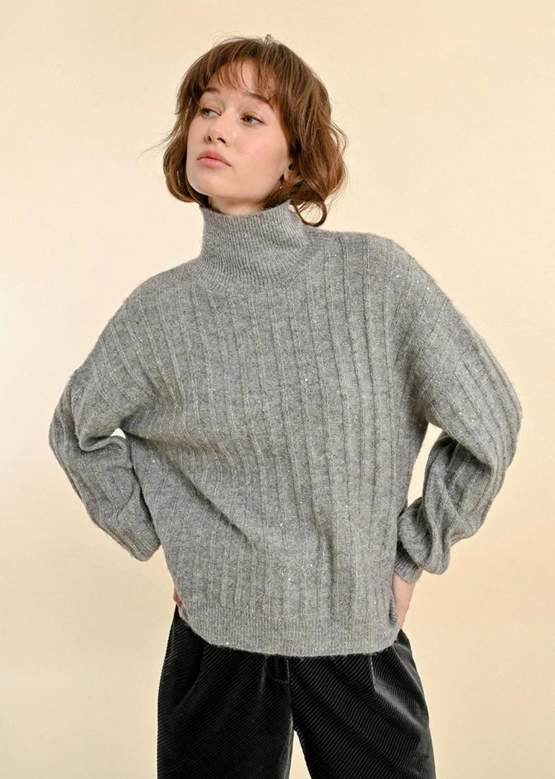 Additional Information: -Slightly puffed long-sleeved sweater-Low armhole-High collar-Sequin-studded knit-Length from the shoulder 53 cm (for a size S) Main material: 50% viscose, 28% polyester, 22%...
