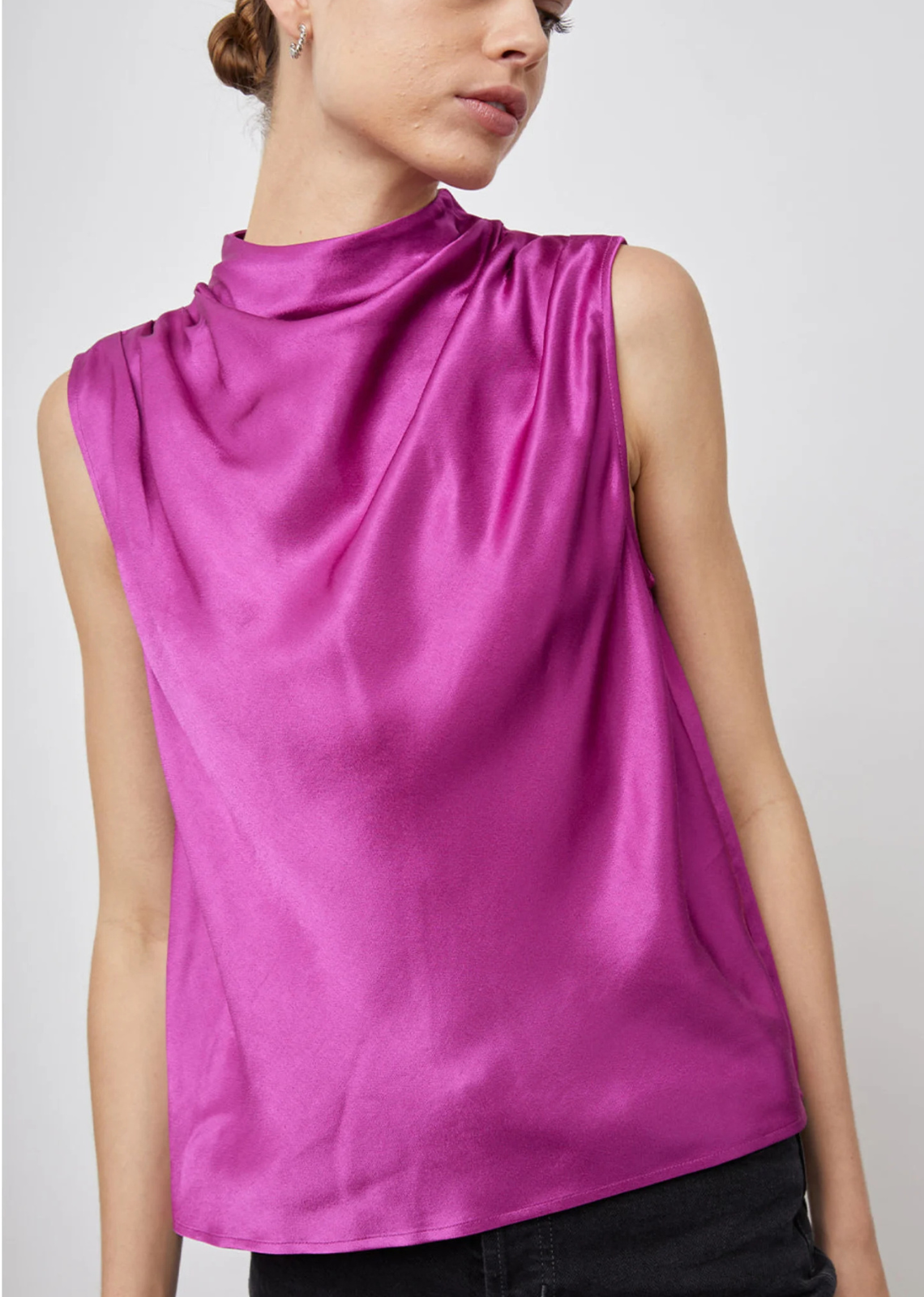 Description: The Kaleen is a classic silhouette to add to your wardrobe as a sleeveless mock neck with draping around the chest. Additional Information: 55%...