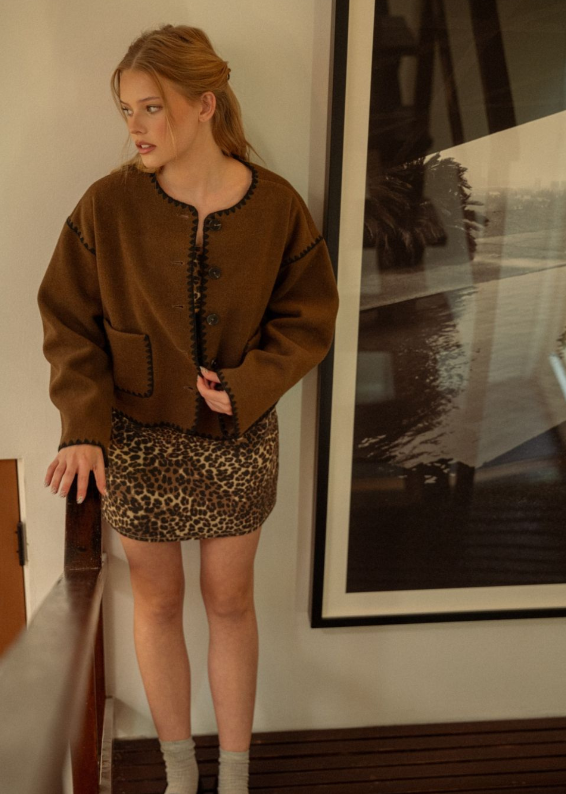 Description: Cropped overshirt jacket crafted from soft textured houndstooth fabric. Features front flap pockets, button down closure, and relaxed dropped shoulders. Soft hand feel with...