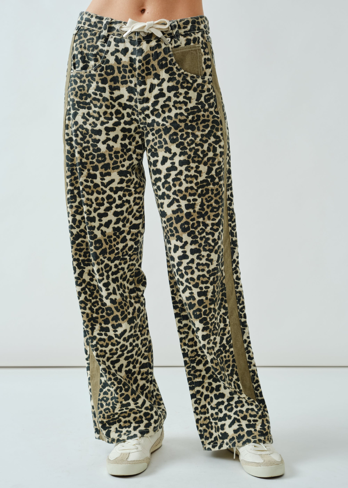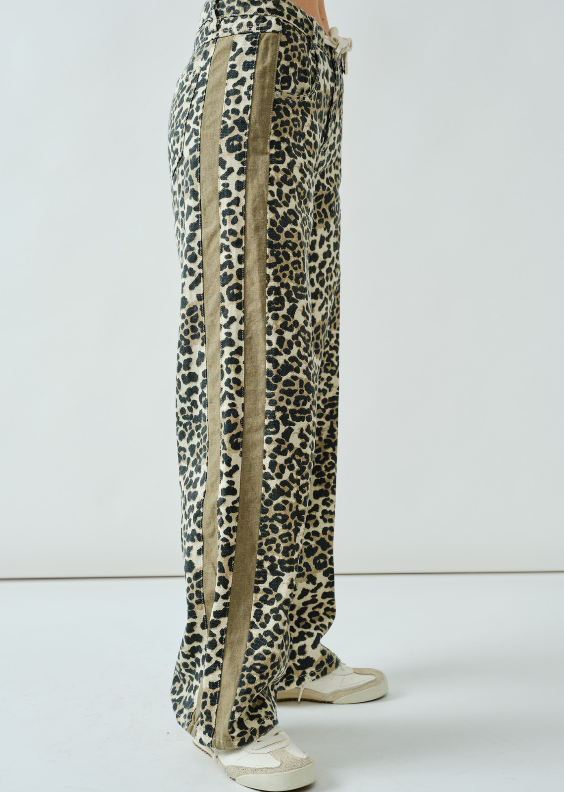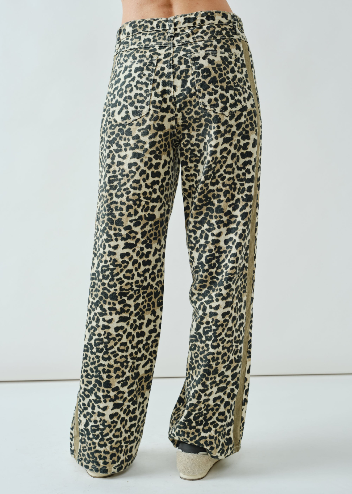 These jeans feature a relaxed slouchy straight-leg silhouette with a vintage wash and eye-catching contrast double-line detailing along the sides. they offer a modern twist on a retro-inspired look.