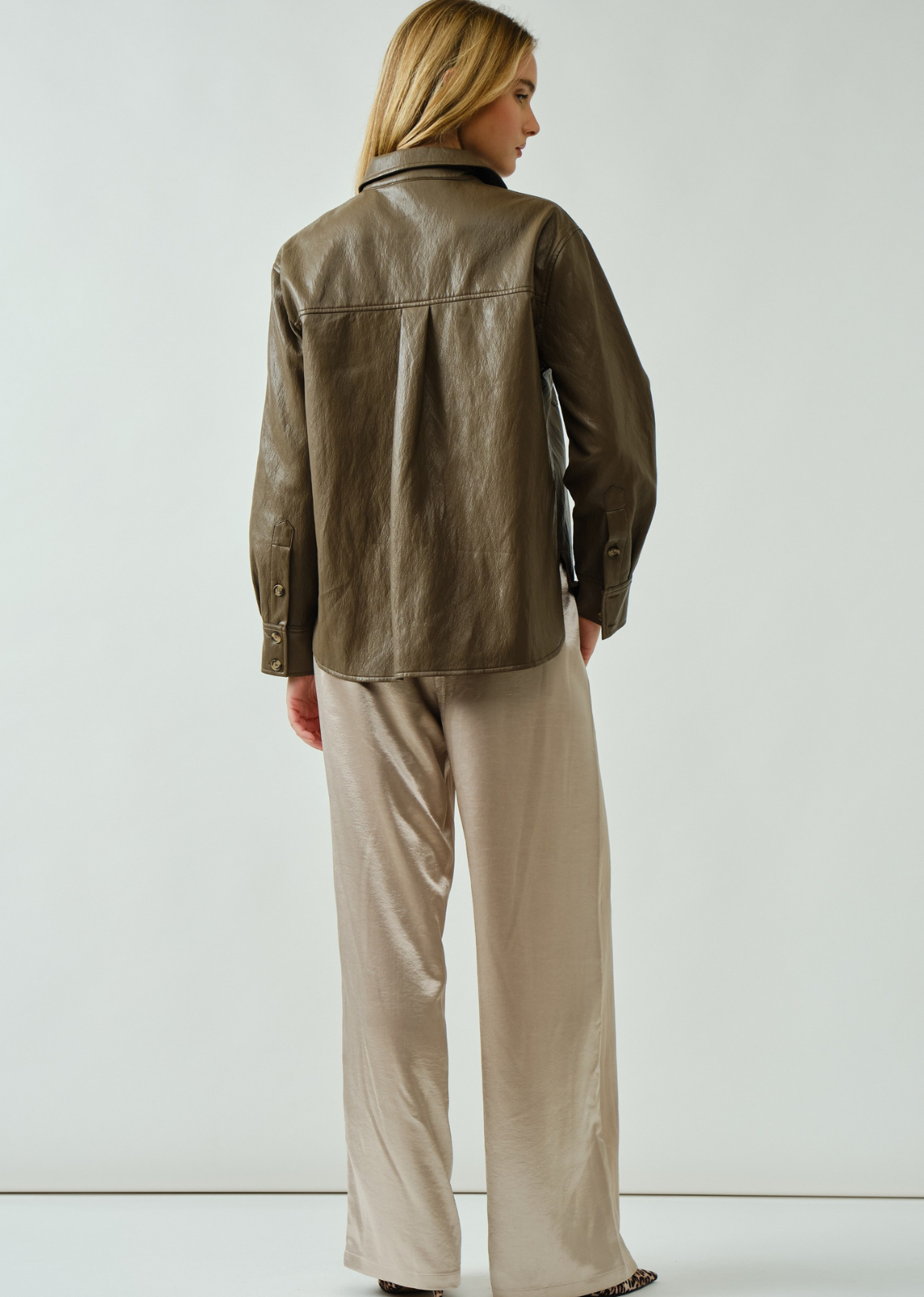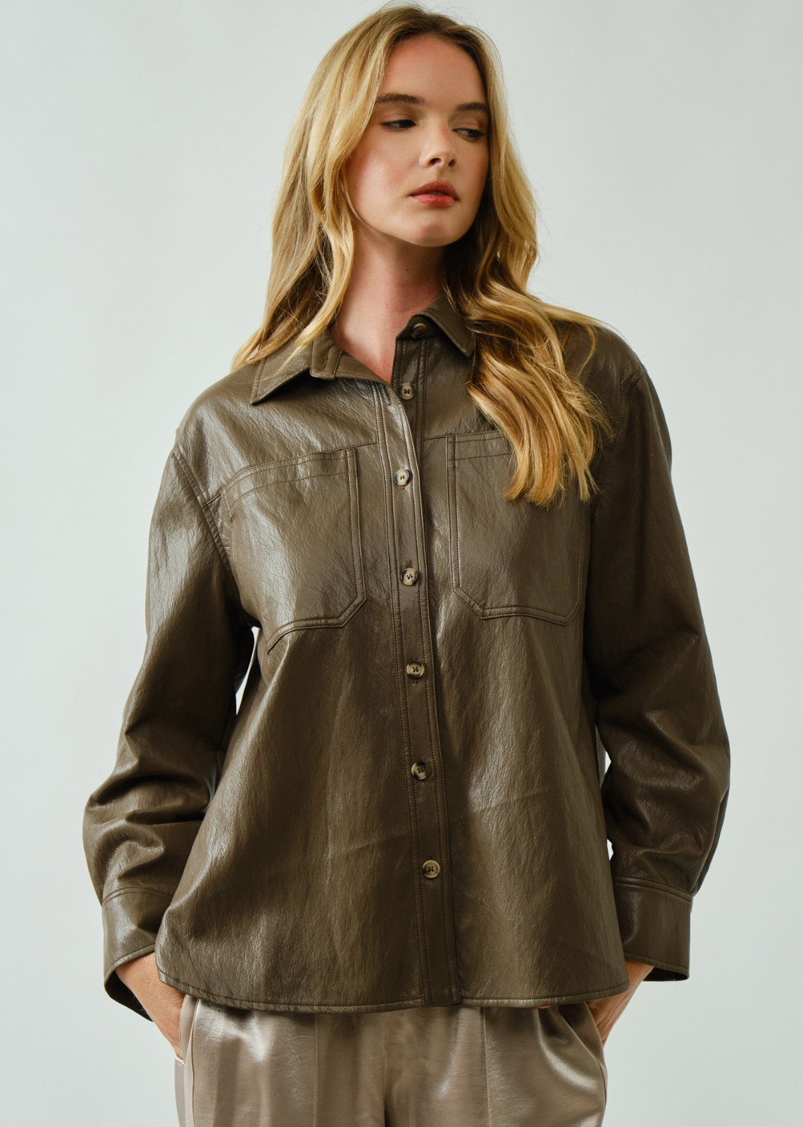 This super soft vegan leather shacket features a crinkle texture. Designed with a relaxed fit, classic collar, and button-down front, it layers beautifully over your favorite basics. Dual chest pockets add utility-inspired style, while the smooth lining ensures all-day comfort.