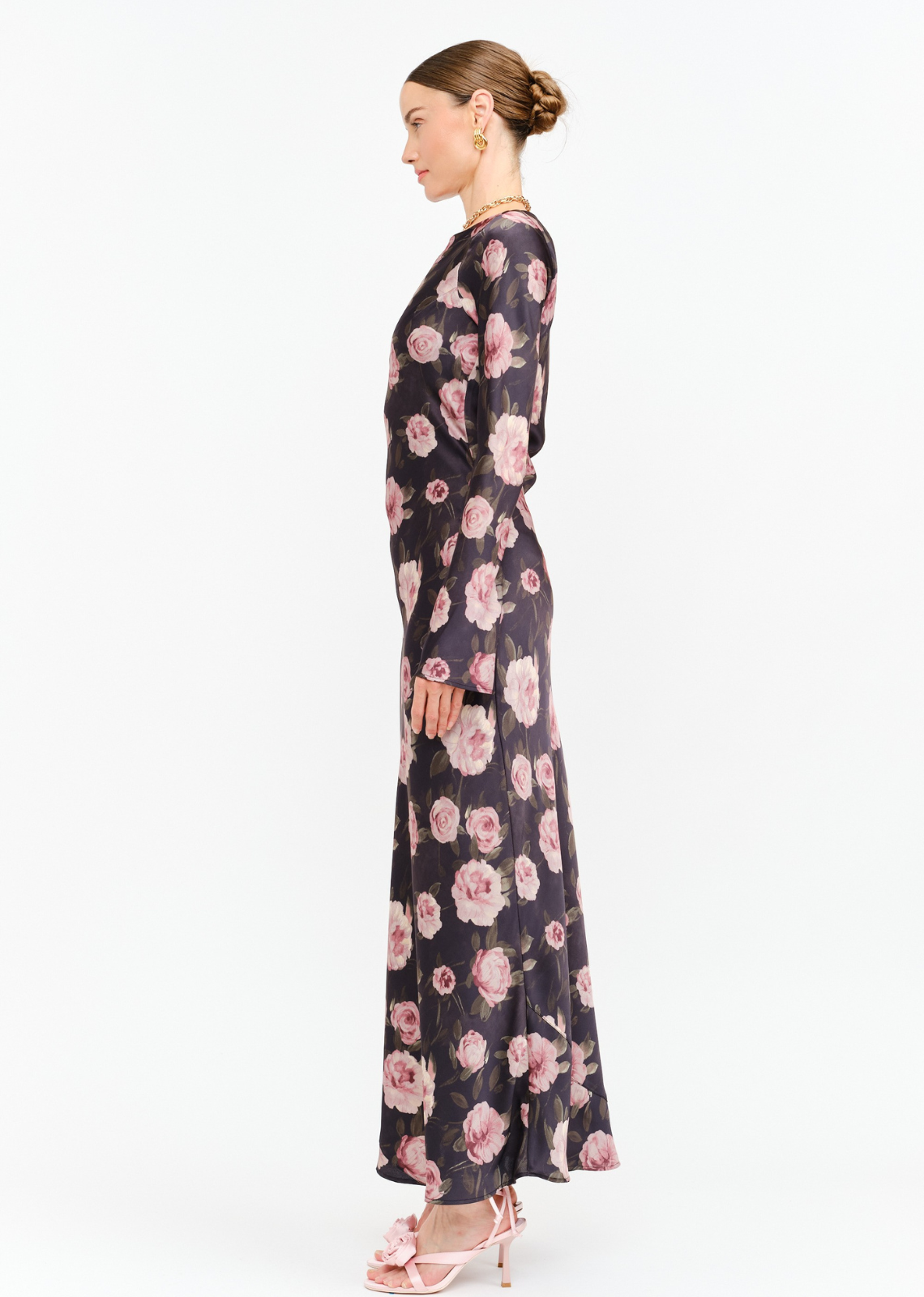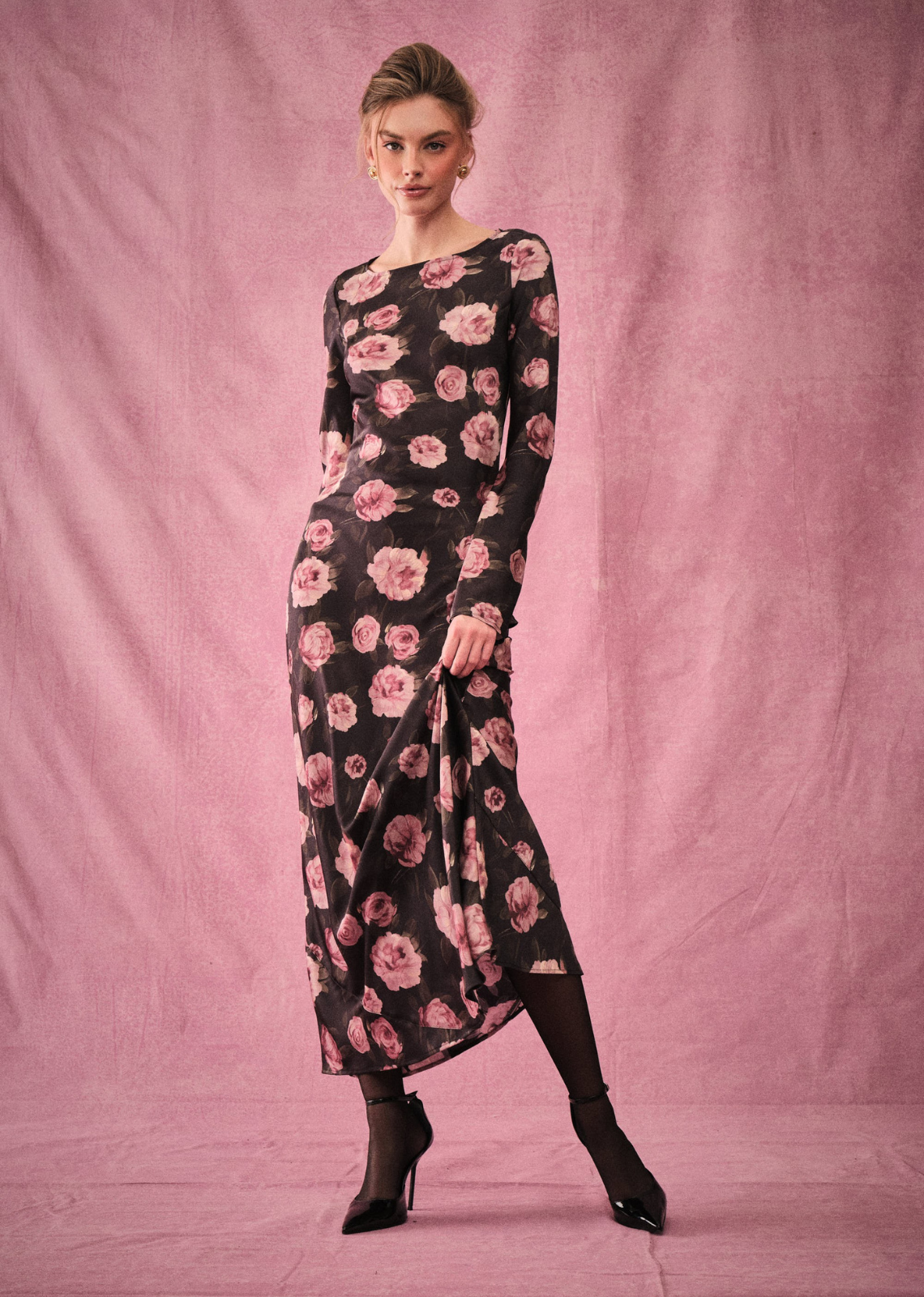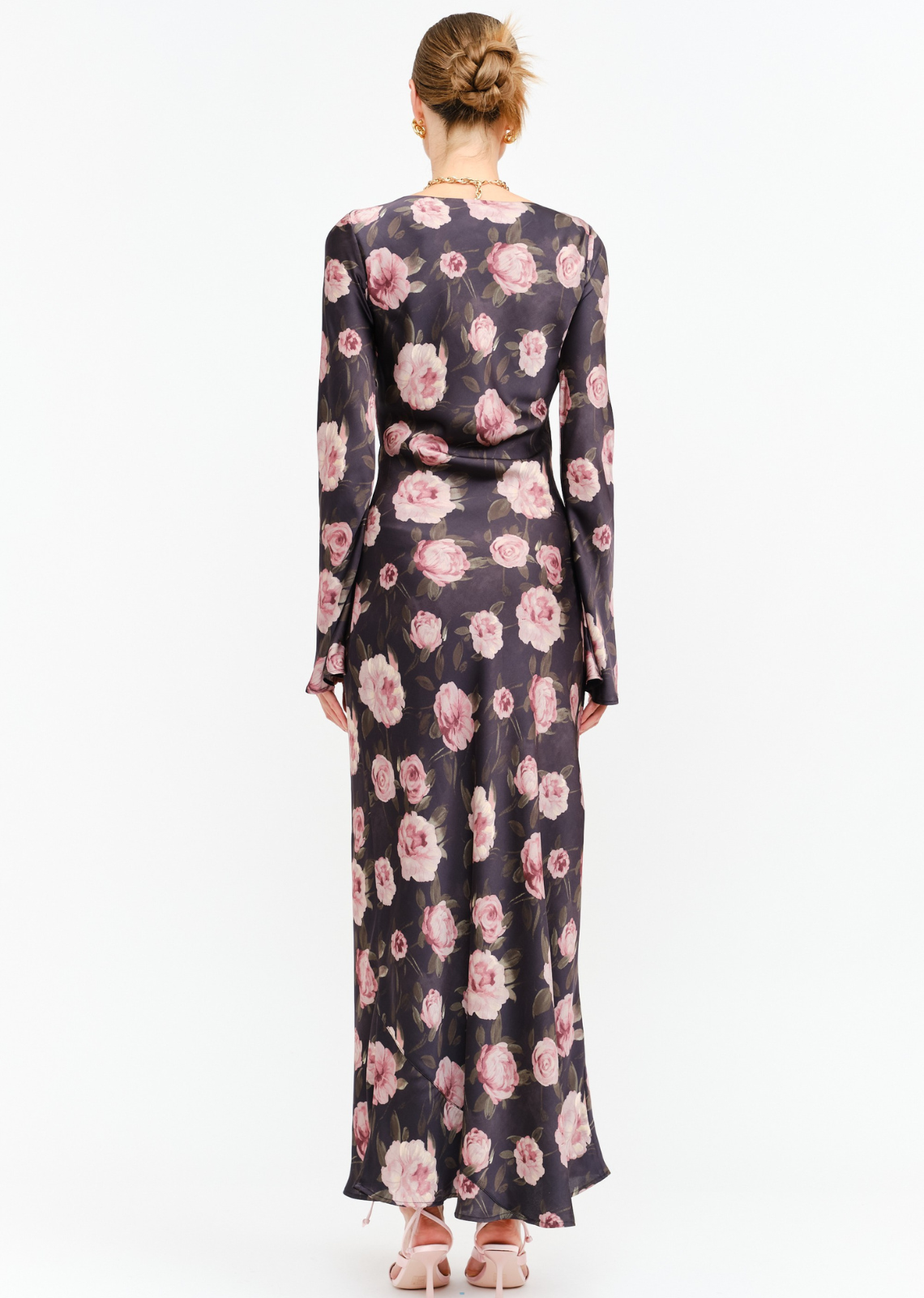 Description: Romance that lingers-this floral maxi dress is a poetic ode to timeless femininity. Crafted with a flowing silhouette and adorned in painterly blush roses...