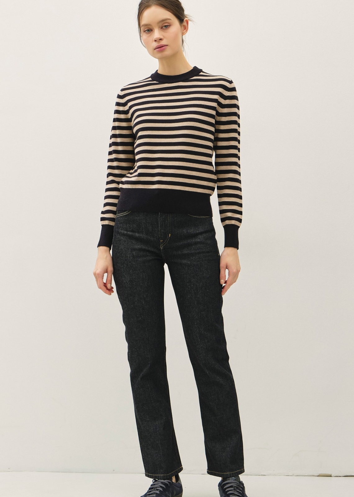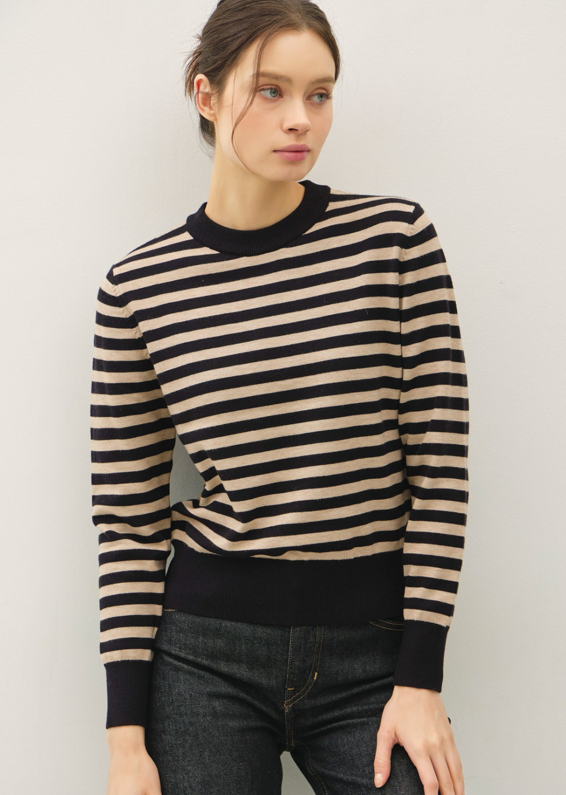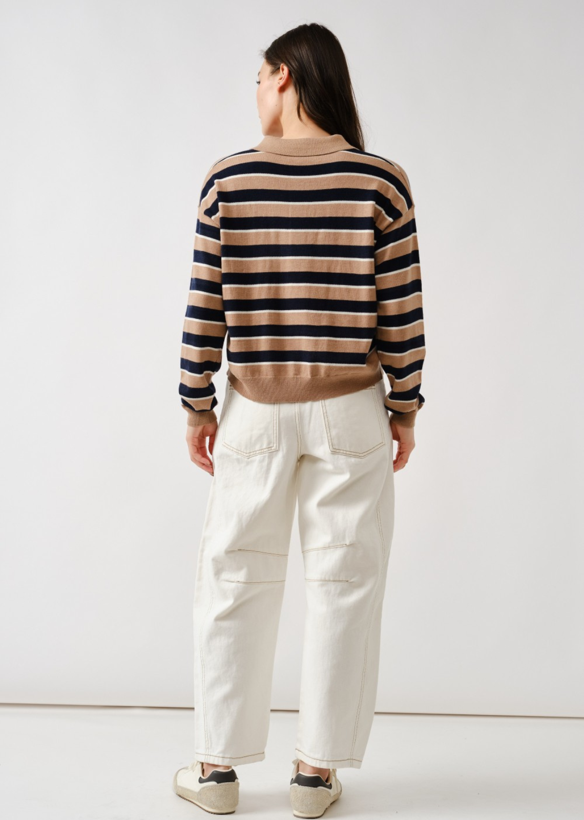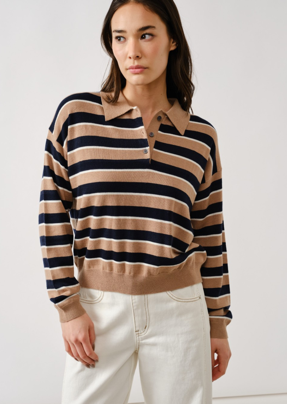 Description: The Drew Rugby Sweater is a classic, preppy knit featuring a traditional rugby-style collar and bold horizontal stripes. Crafted from soft, mid-weight for comfort...