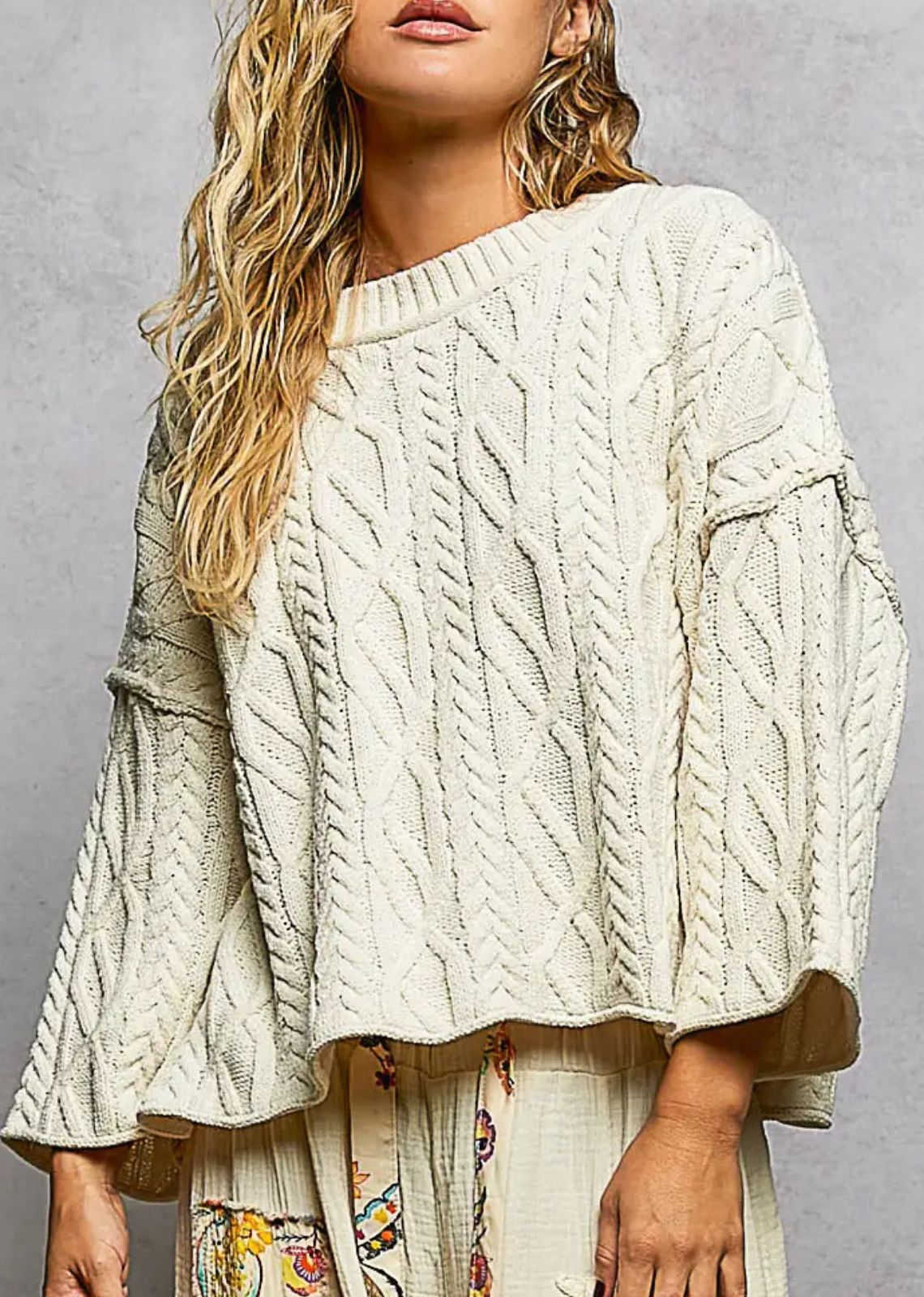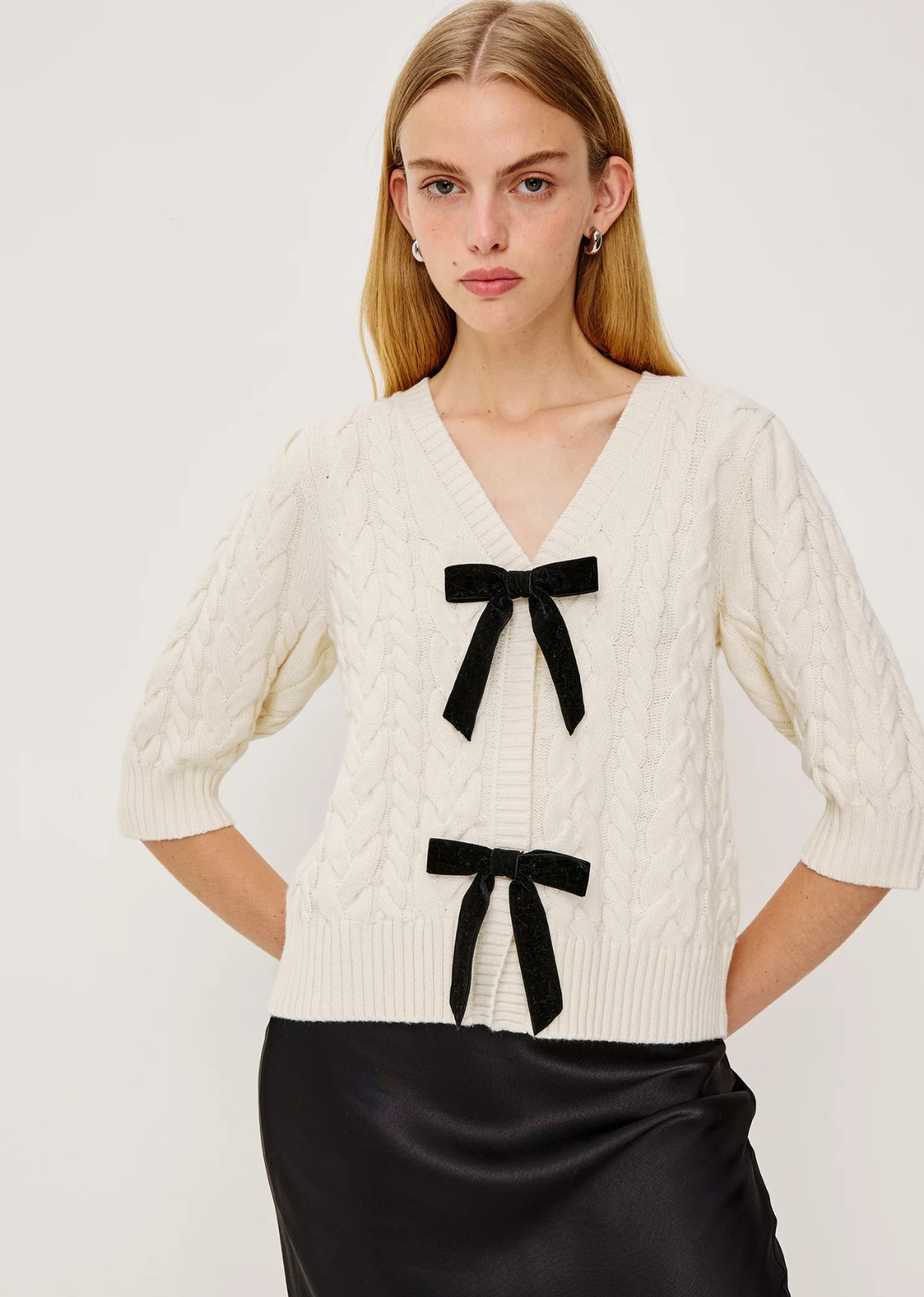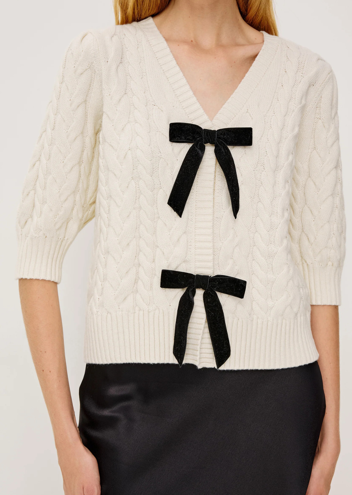 Description: Timeless and romantic, the Clarissa celebrates elegant charm with its contrasting velvet bows. Made from a sumptuously soft cable knit, this relaxed cropped sweater...