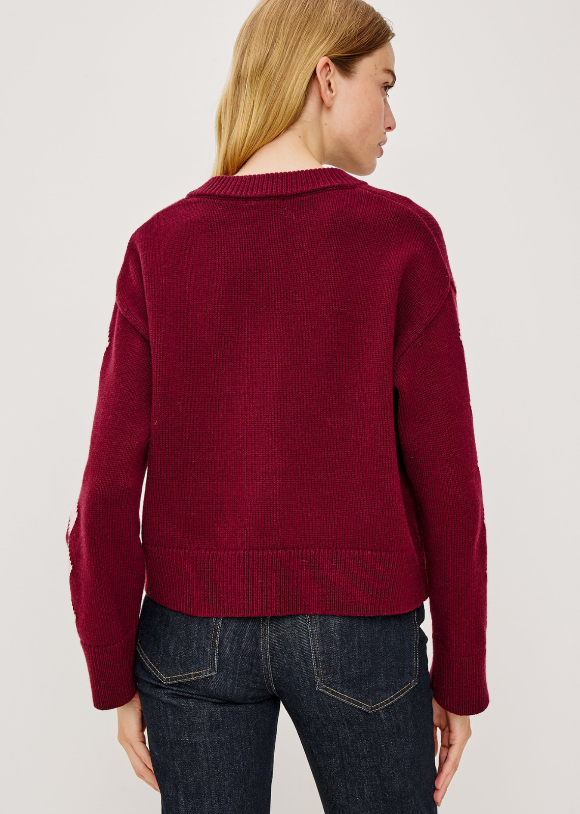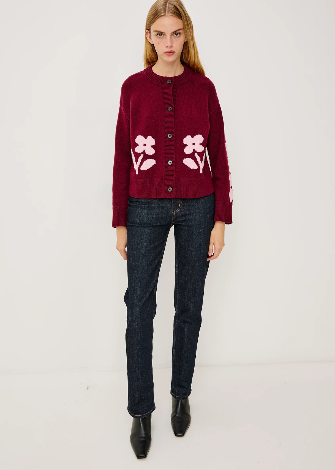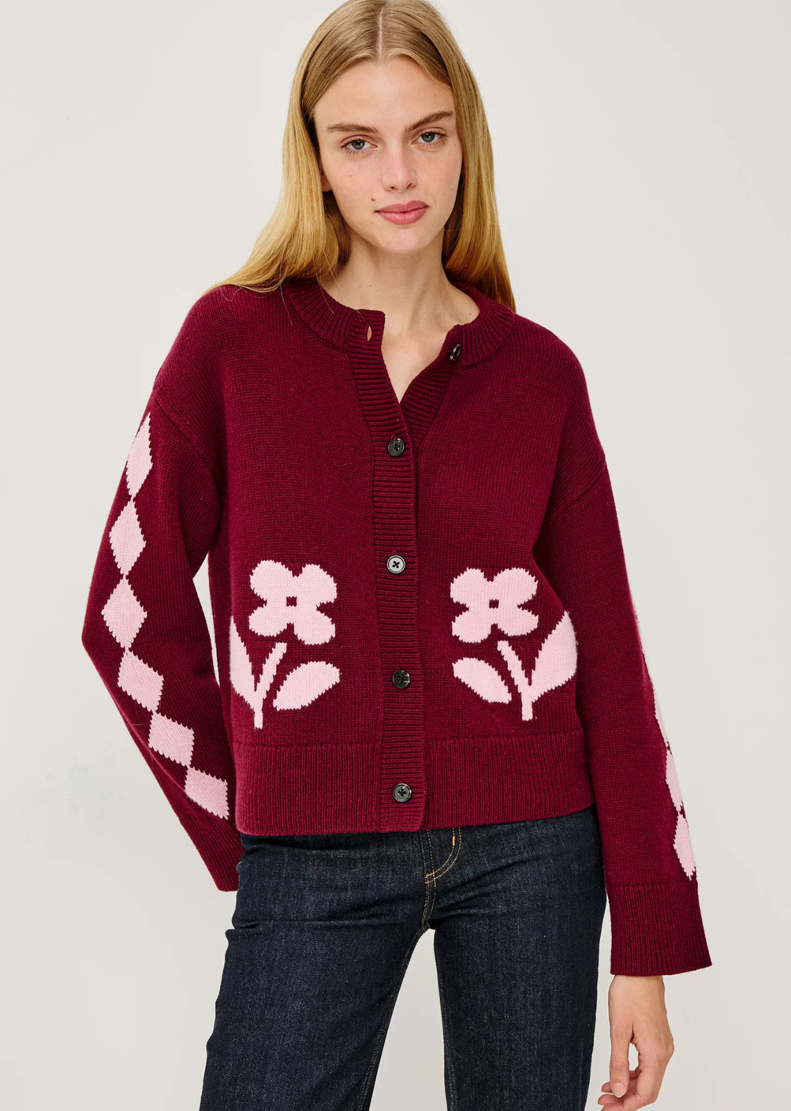 Description: The Mavie blends classic charm with modern comfort. This relaxed-fit wool-blend cardigan features delicate front floral motifs and diamond detailing along the sleeves, with...