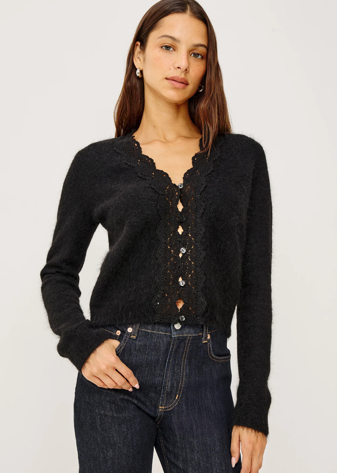 Description: Romantic and effortlessly graceful, the Marie Lace Trim Bell Sleeve Cardigan adds a touch of vintage-inspired charm to any outfit. Crafted from a soft,...