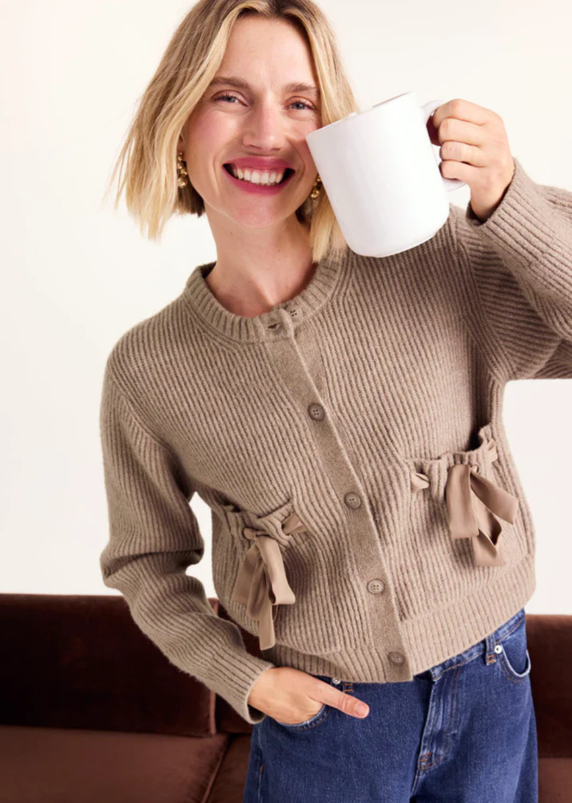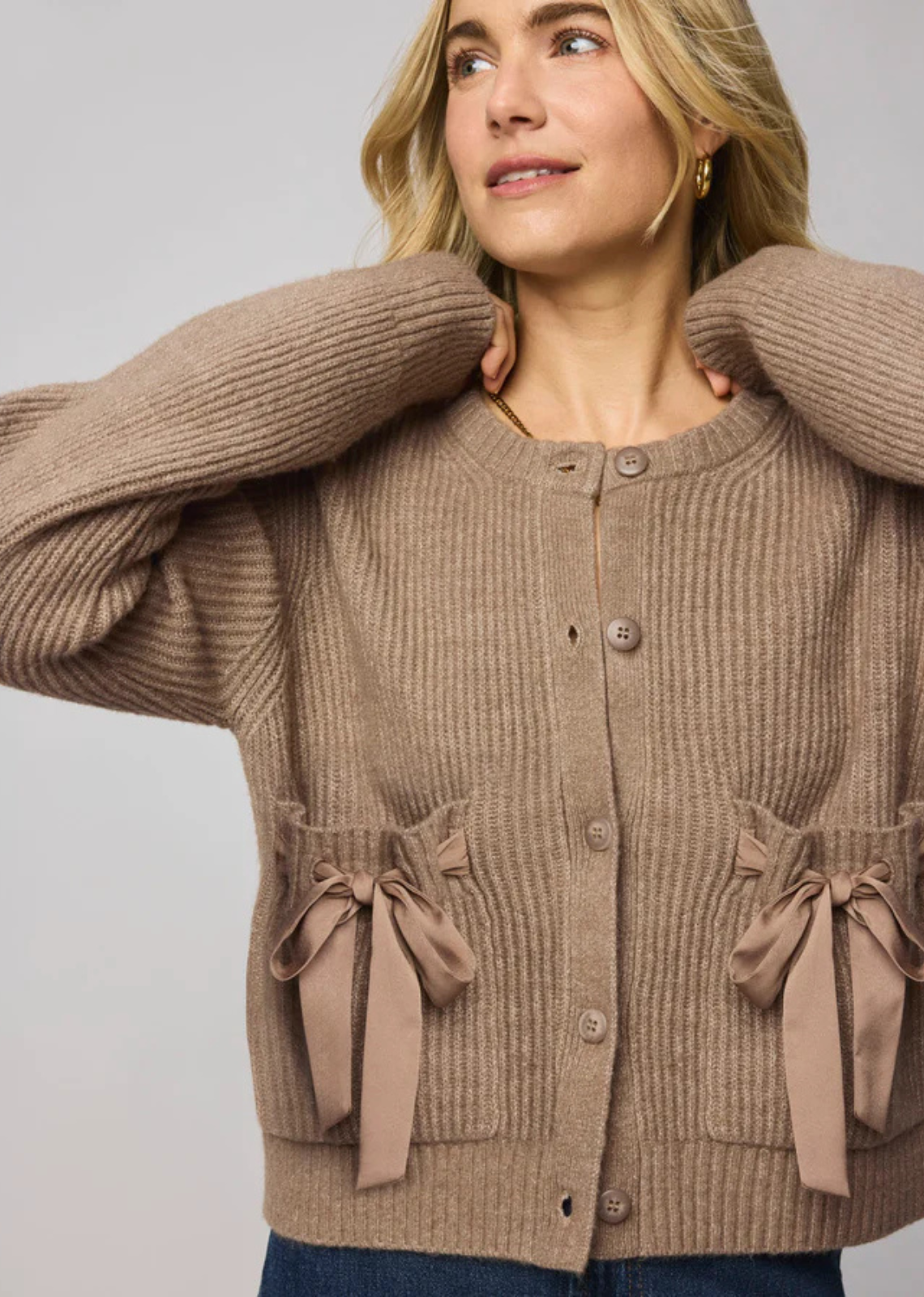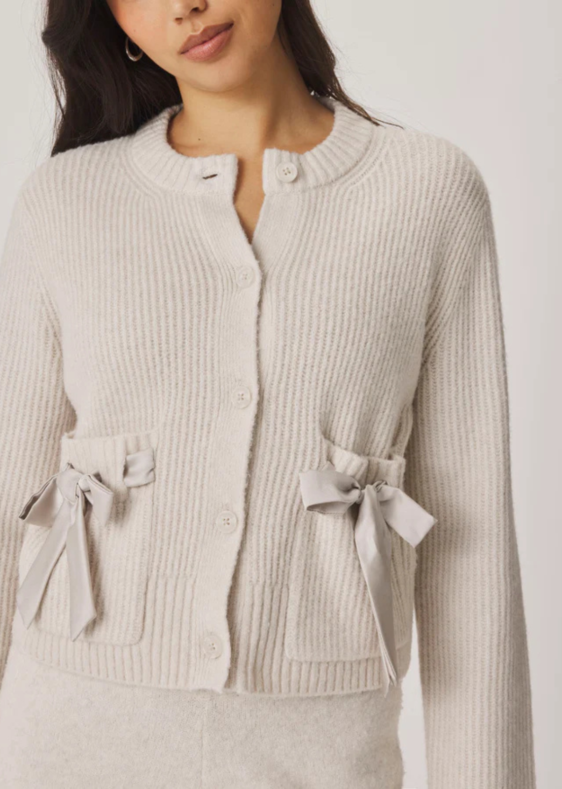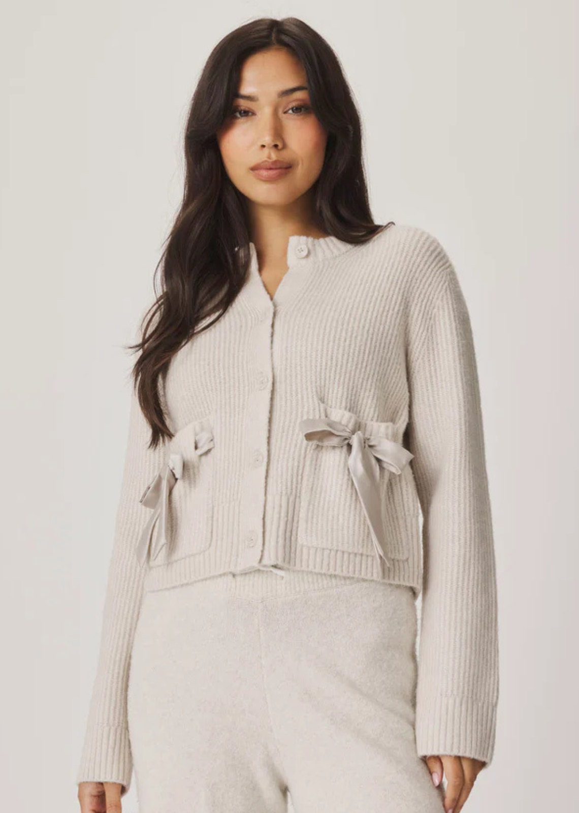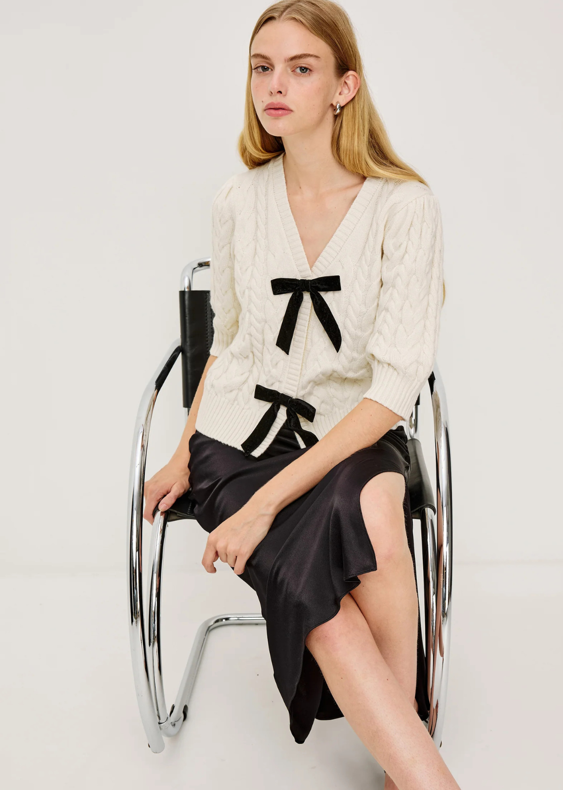 Description: A cardigan with a luxe twist. The Stassi Satin Tie Cardigan is crafted from a cozy ribbed knit and elevated with satin bow details...