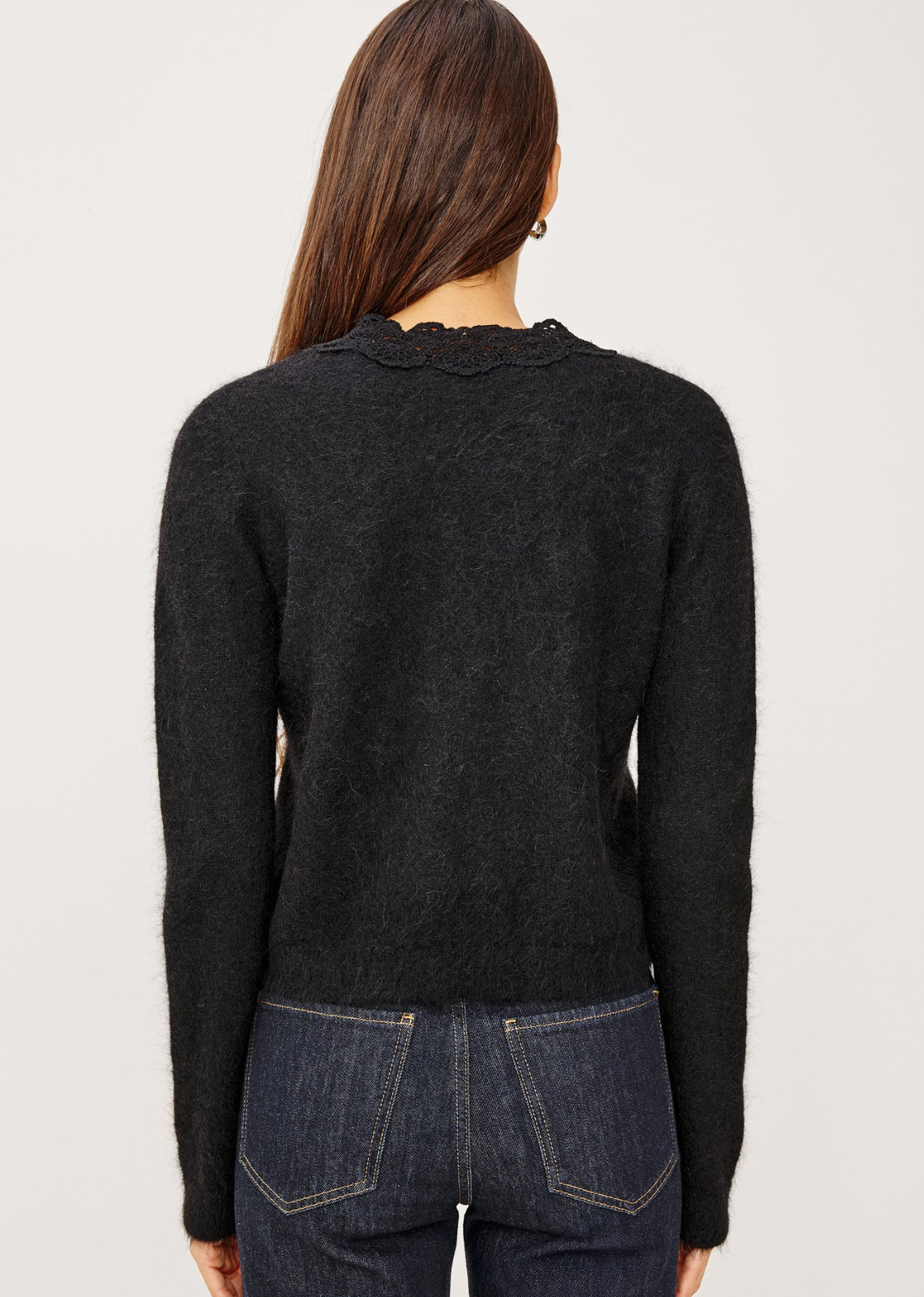 Description: Elegance in every stitch. Knitted from a soft alpaca-wool blend, the Mer features a flattering V-neckline trimmed with delicate lace extending to the hem....