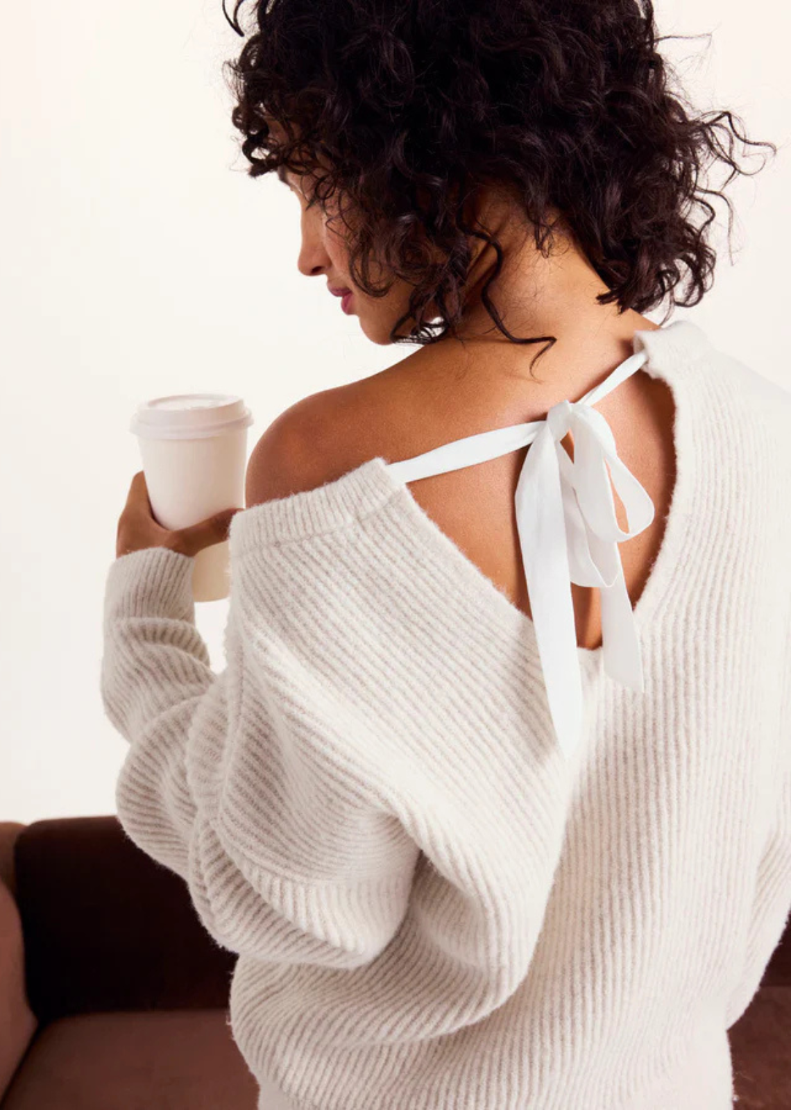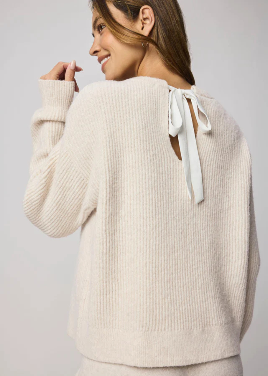 Description: The Stassi Satin Tie Sweater gives a luxe twist to your favorite cozy knit. Crafted in a soft ribbed texture, this sweater is elevated...