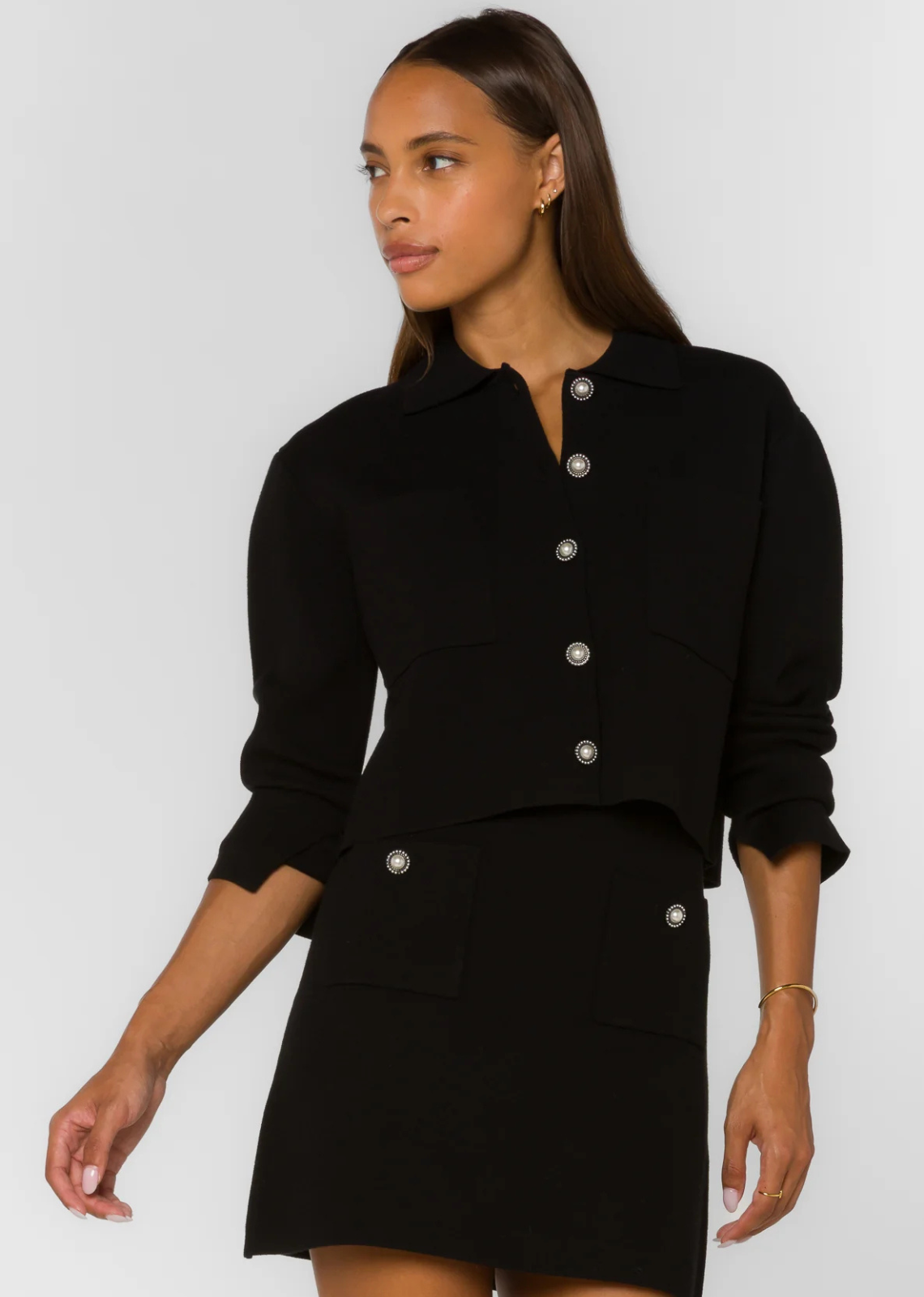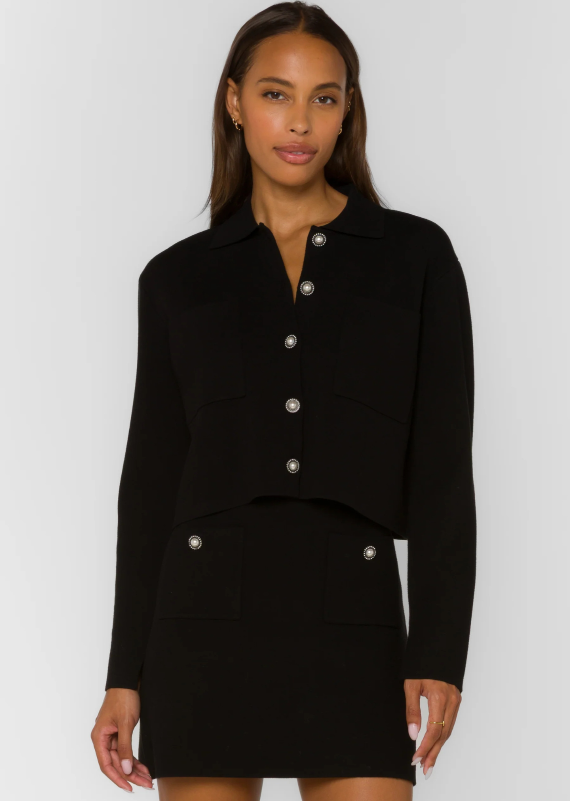 Description: This long sleeve cropped cardigan features pearl novelty buttons large chest pockets and crafted from a medium weight fabric with stretch and structure. Shop...