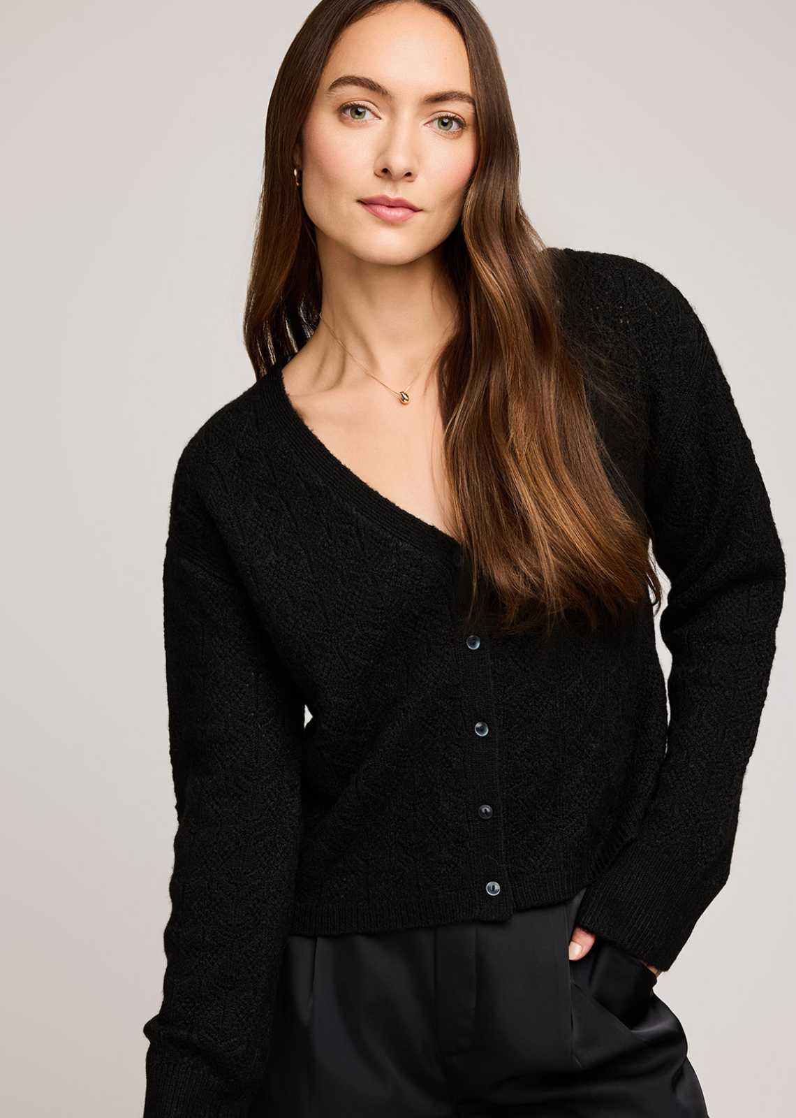 Description: The Lila cardigan is made of a soft yarn in a novelty pointelle stitch pattern. Features include a v-neckline and button front closure. Additional...