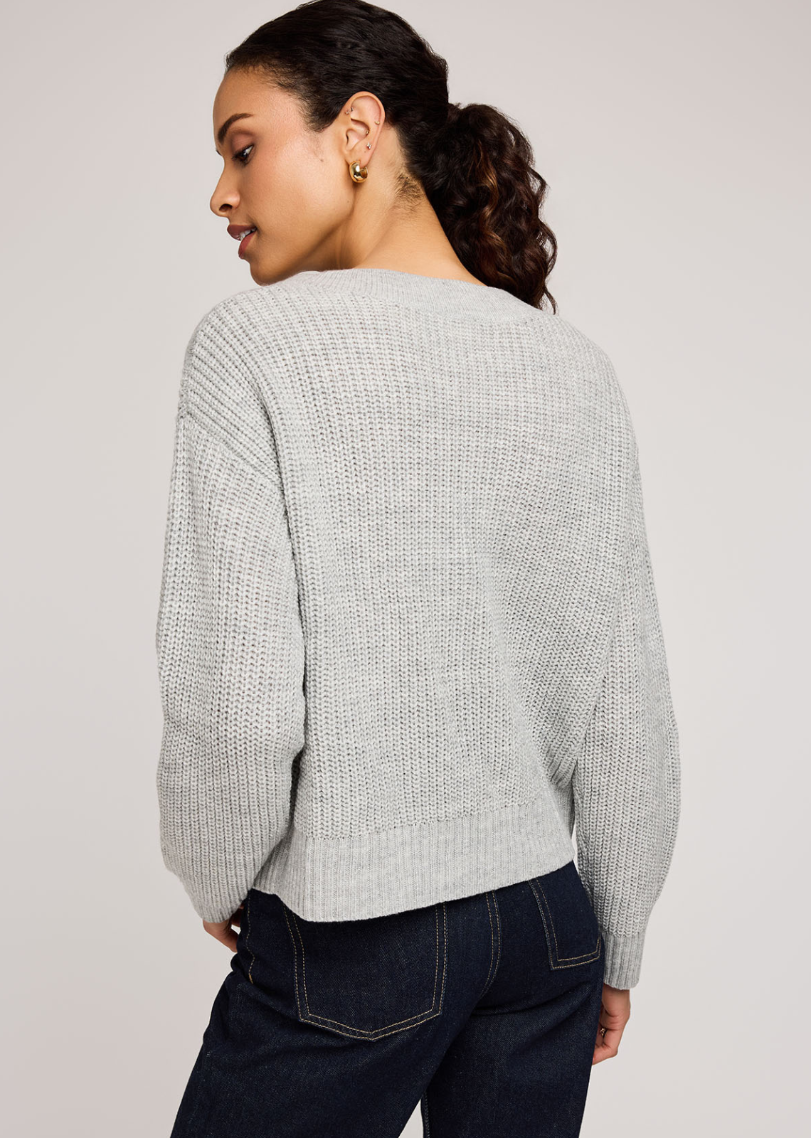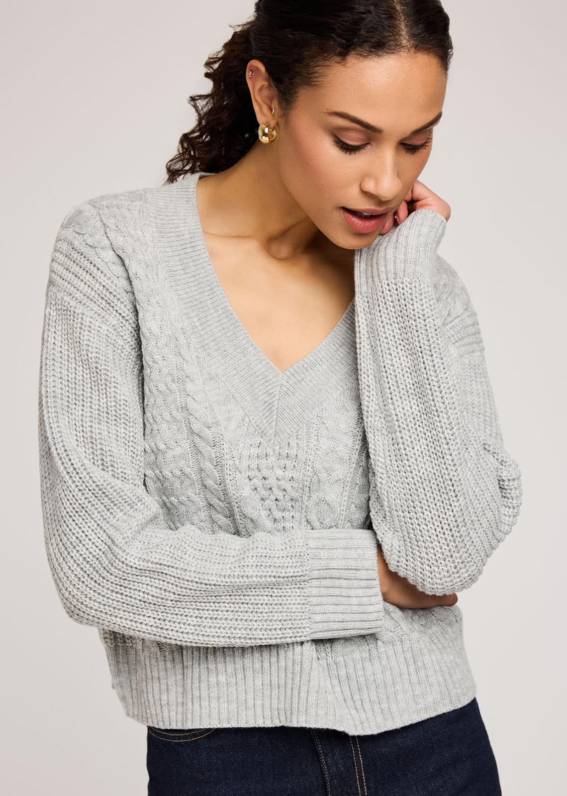 Description: The Marcie sweater is made of a soft yarn. Features include a v-neckline and cable knit details throughout. Additional information: 99% acrylic, 1% nylon...
