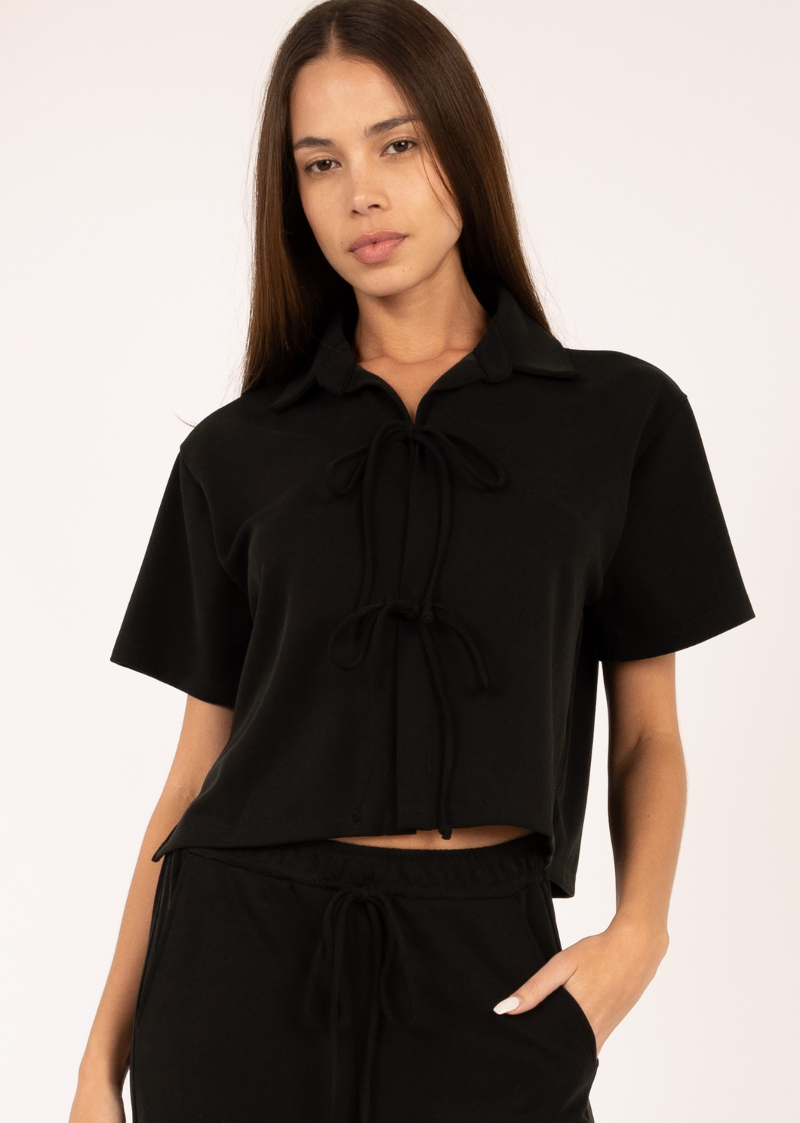 Description: Tie front soft tee! Pair with the matching pant for the perfect elevated lounge set! Additional information: 54% Rayon 39% Polyester 7% Spandex 1499ET