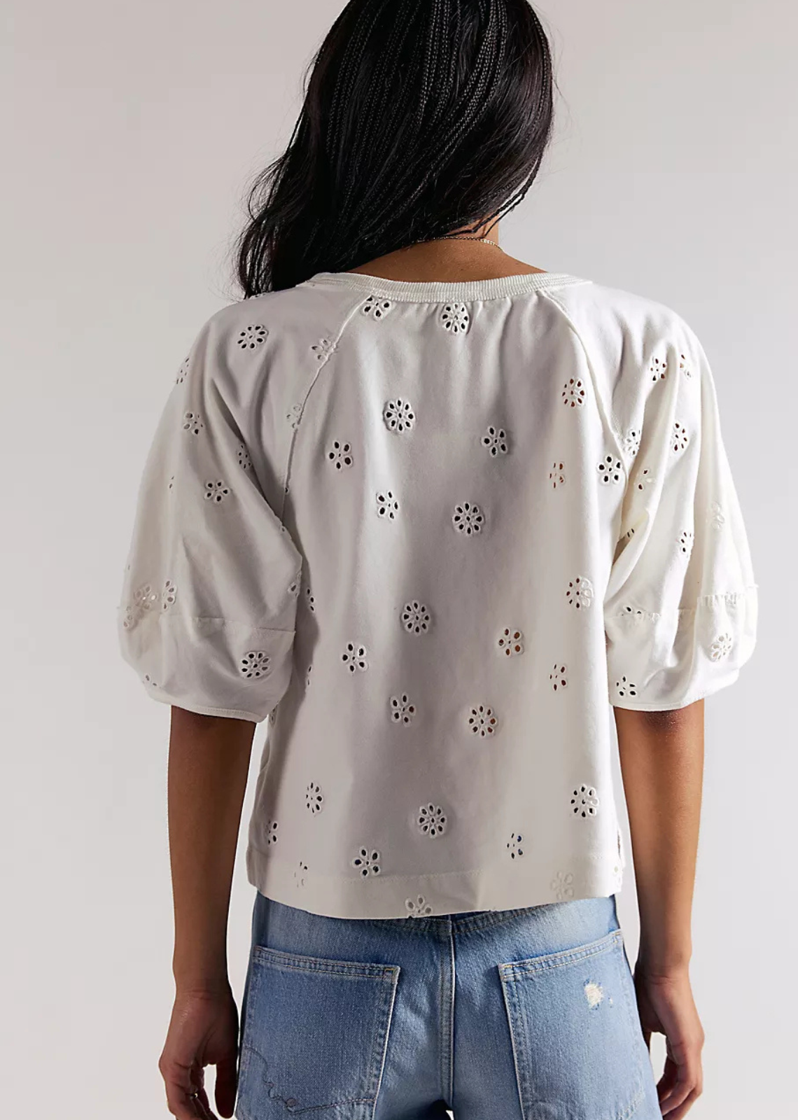 Description: Embody effortless whimsy with this airy tee, featuring a cropped, boxy silhouette, exaggerated puff sleeves, and a lightweight cotton-blend fabrication for a breezy feel....