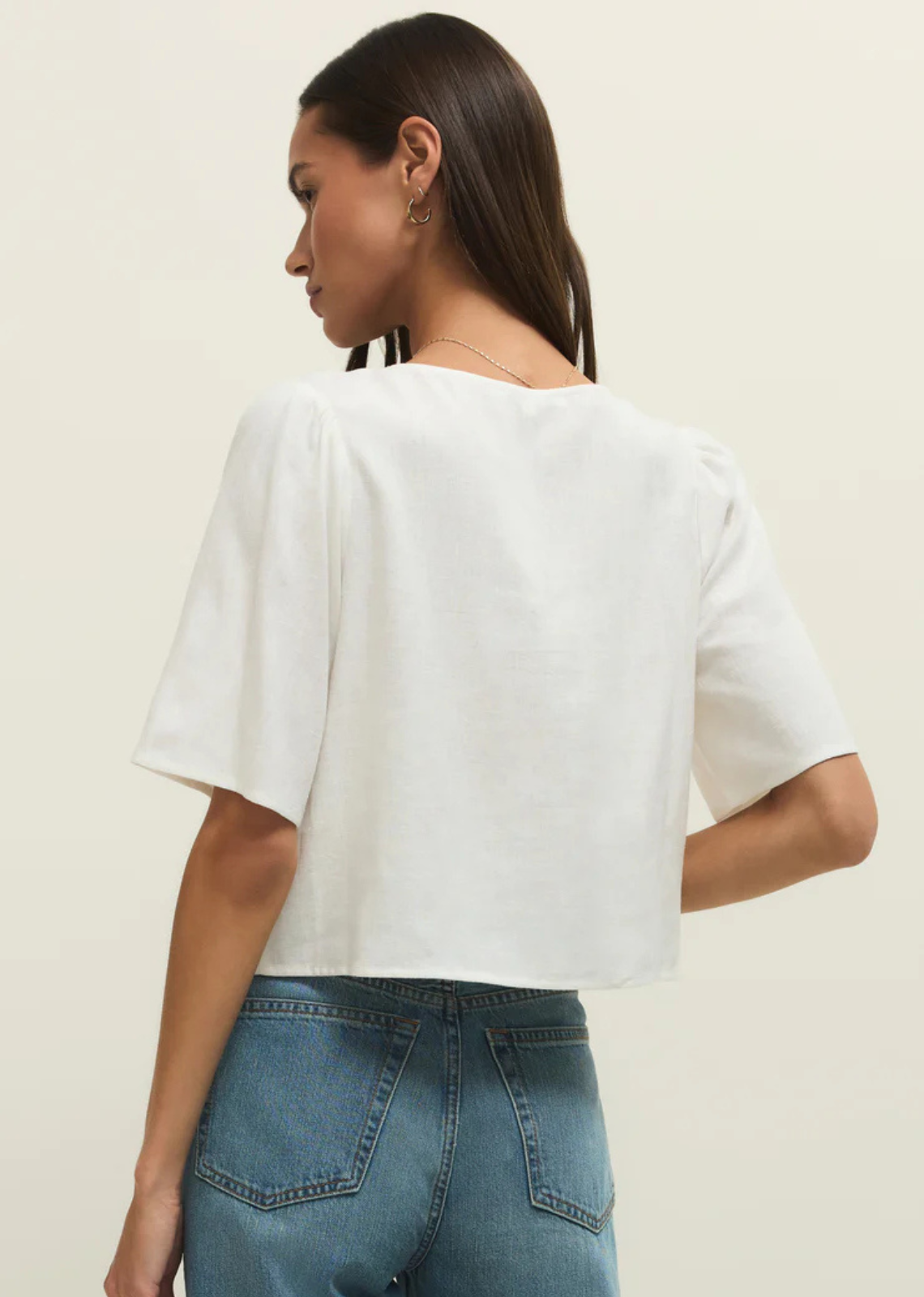 Description: This feminine top is an instant favorite with its washed linen blend fabric, flattering relaxed fit, and tie front, finished with a modesty placket...