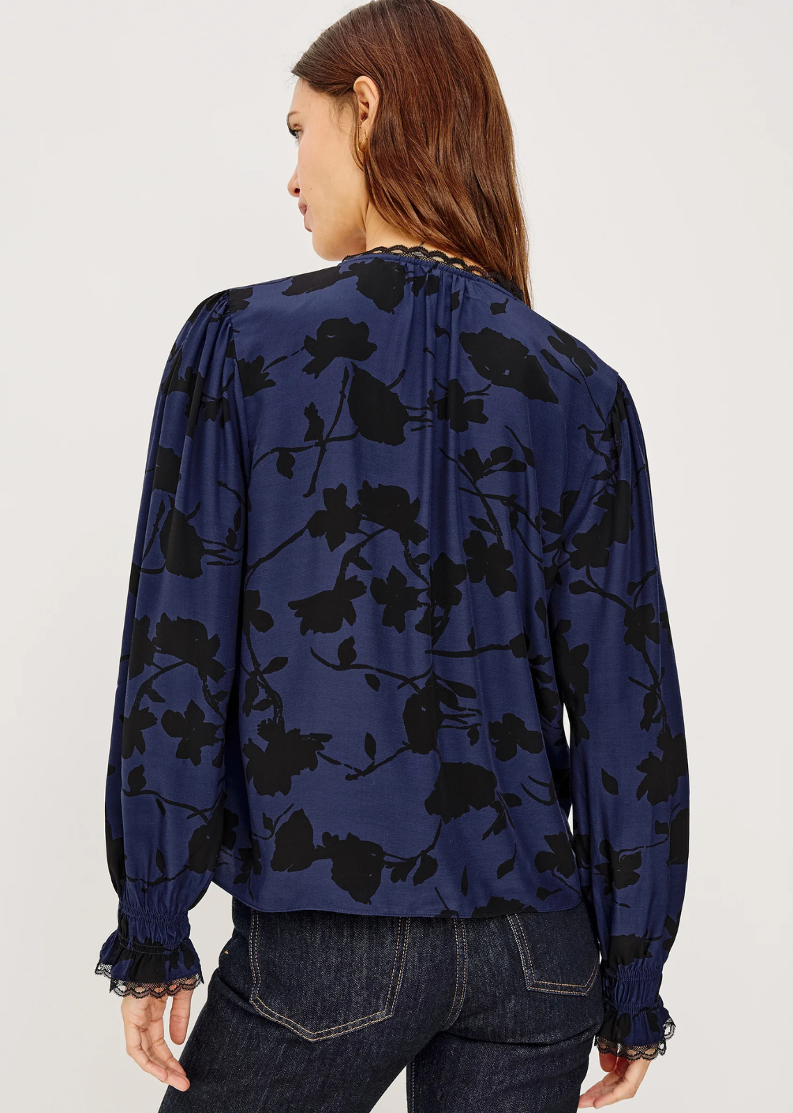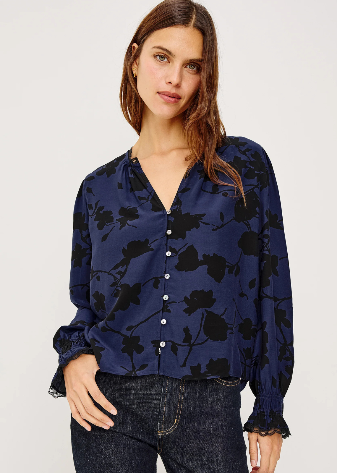 Description: Designed for effortless romance, the Magda has a V-neckline and front shell buttons, with flocked velvet florals and lace trim adding feminine detail. Puff...
