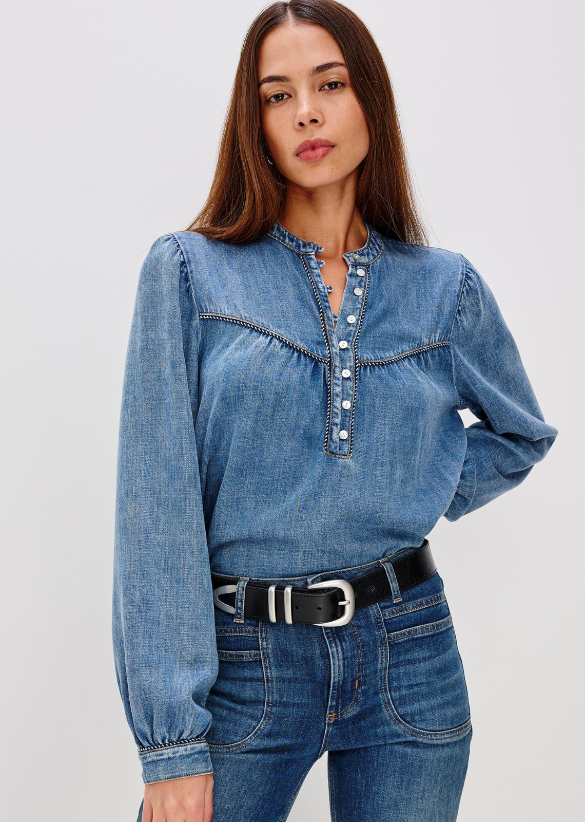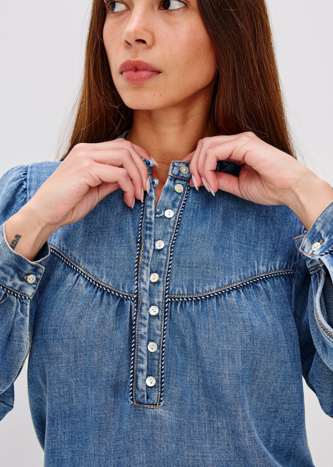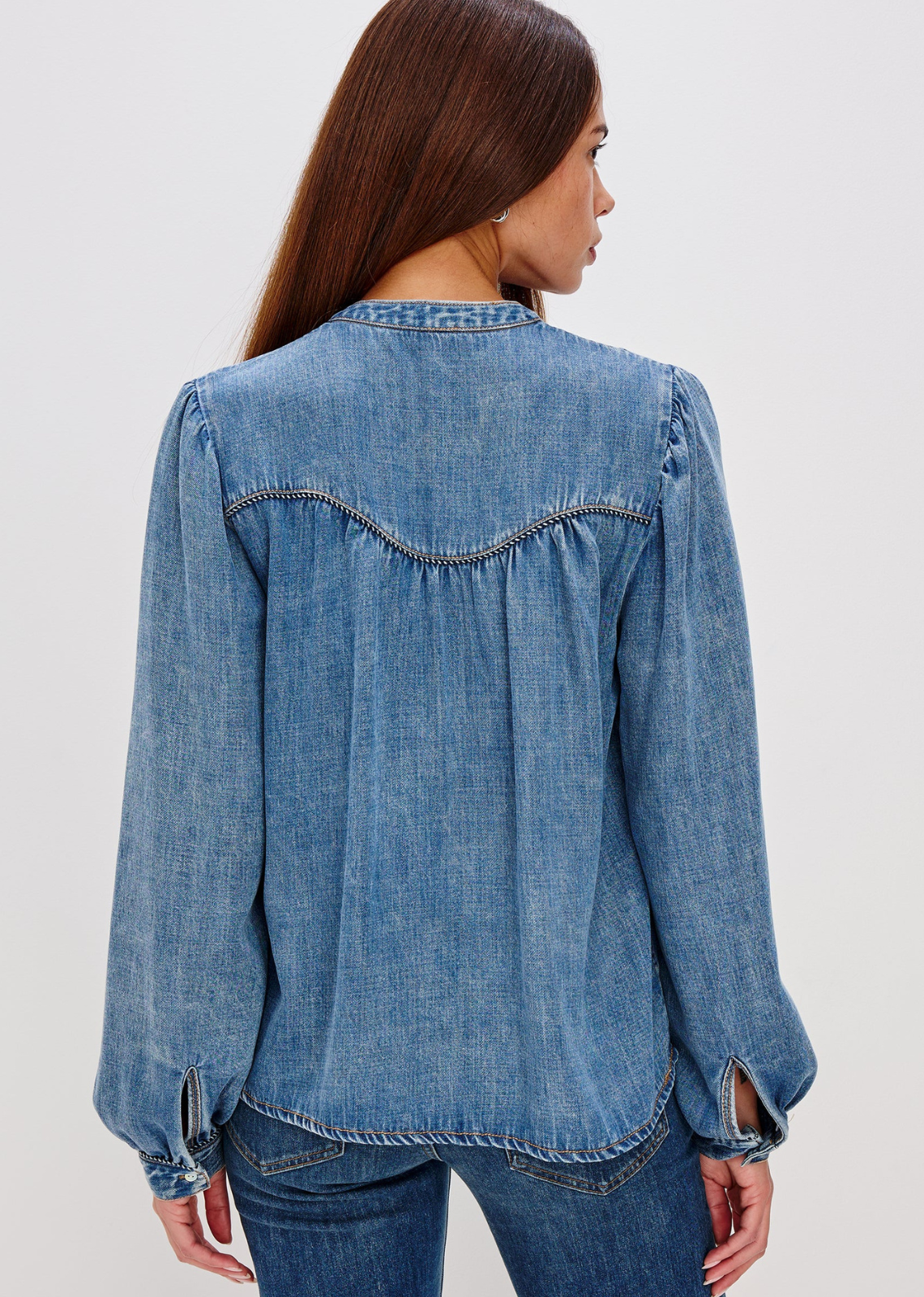 Description: The Sunna is a timeless denim shirt with a lived-in wash. It features a half front placket with shell buttons, two-toned twist piping, a...