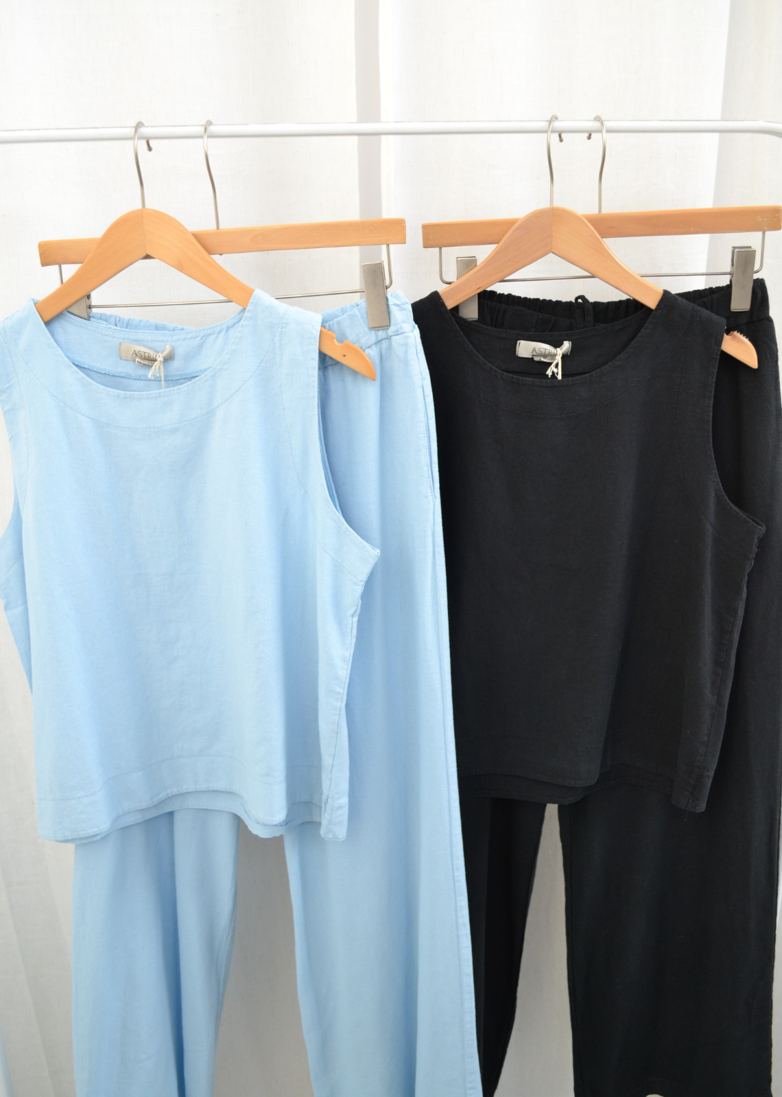 Description: Perfect classic linen blend tank! In beautiful light blue and classic black. Pair with the matching drawstring pants! Additional Information: 55% Linen 45% Viscose...