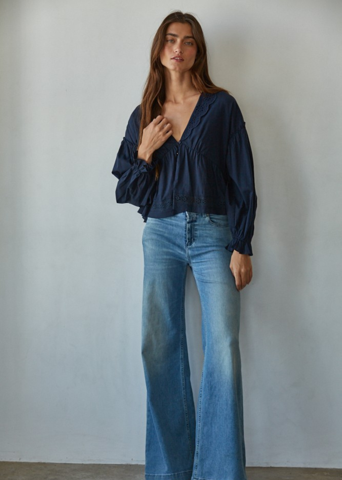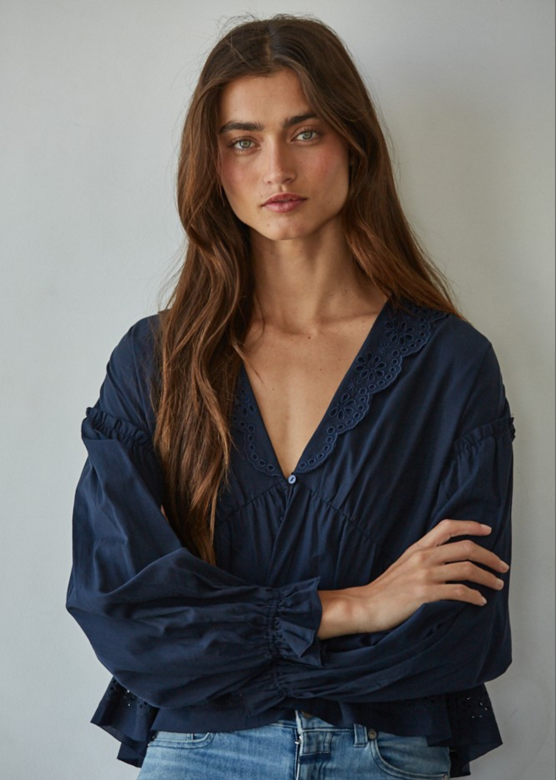 Description: woven Lyocell Cotton Eyelet Collar Plunged V-Neck Button Down Long Sleeve Blouse Top With Lace Trim Detail Additional Information: 50% Lyocell, 50% Cotton L8784