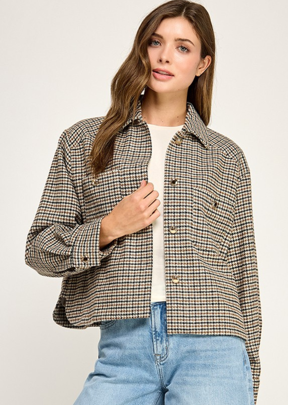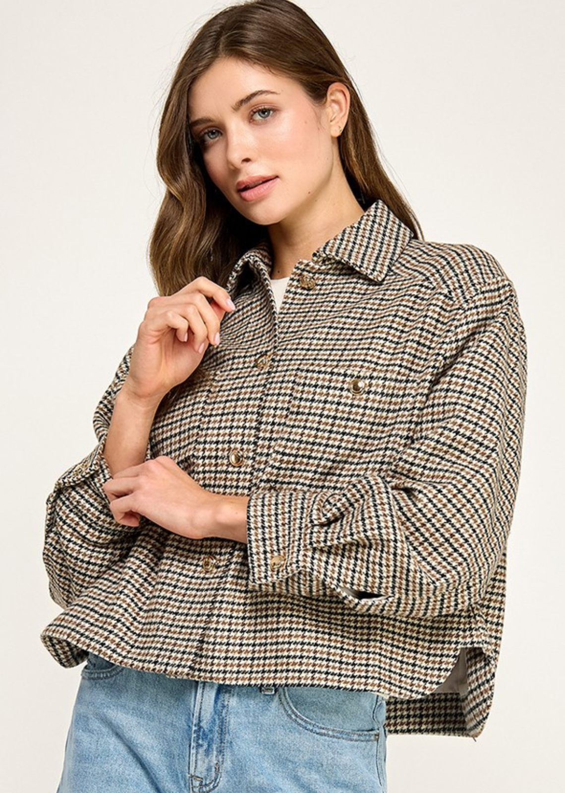 Description: Cropped overshirt jacket crafted from soft textured houndstooth fabric. Features front flap pockets, button down closure, and relaxed dropped shoulders. Soft hand feel with...