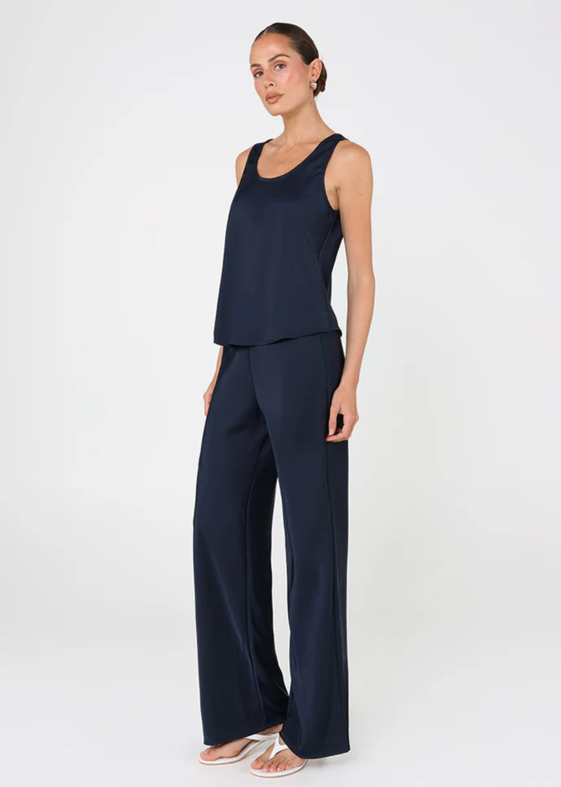 Description: Navy blue scoop neck relaxed tank in a silky fabrication. Bias cut Additional information: 100% Polyester Cold hand wash MS3901