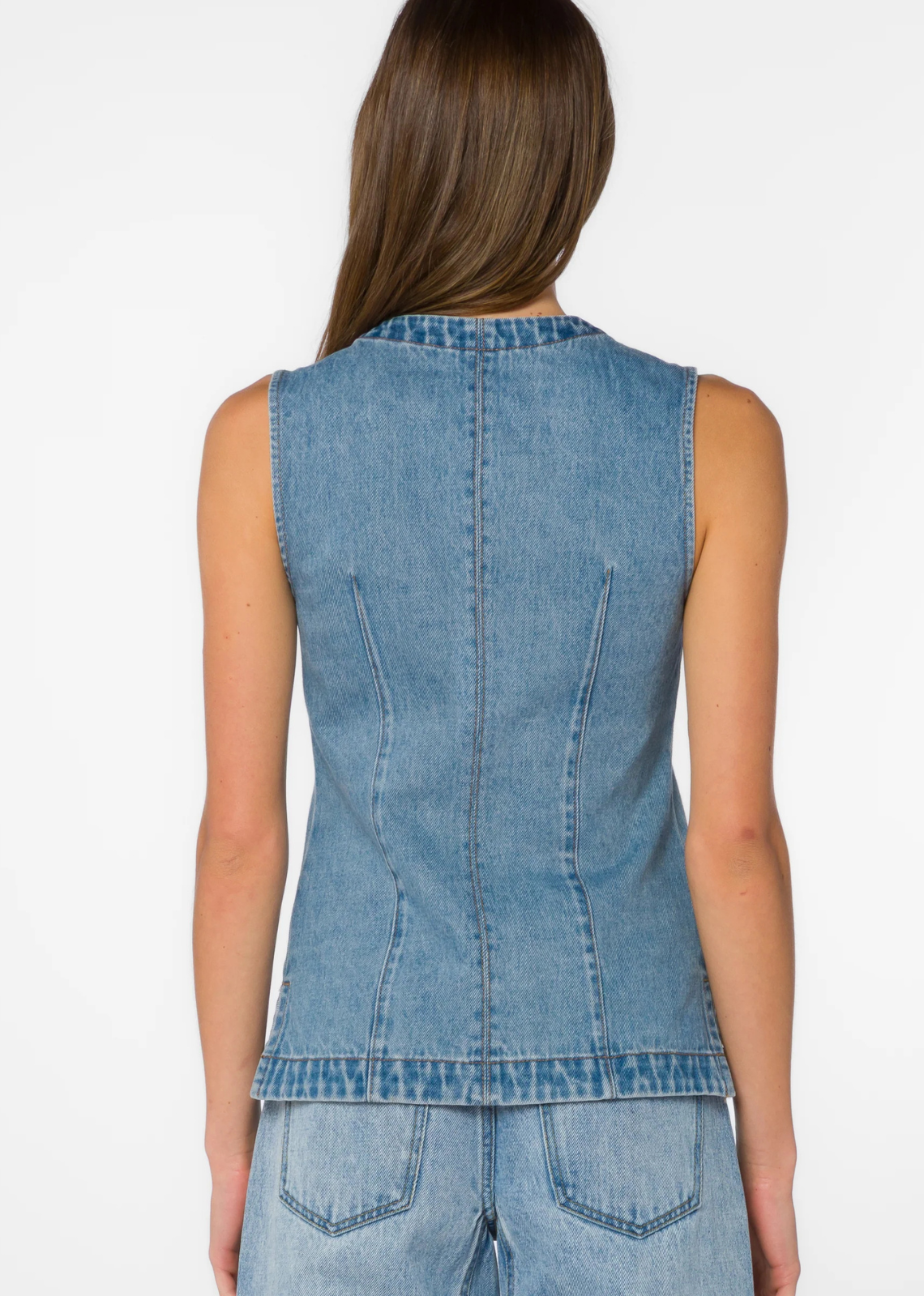 Description: This long denim vest features a split hem detail, chest flap patch pockets and a structured form flattering fit. Runs SMALL, recommend sizing UP....