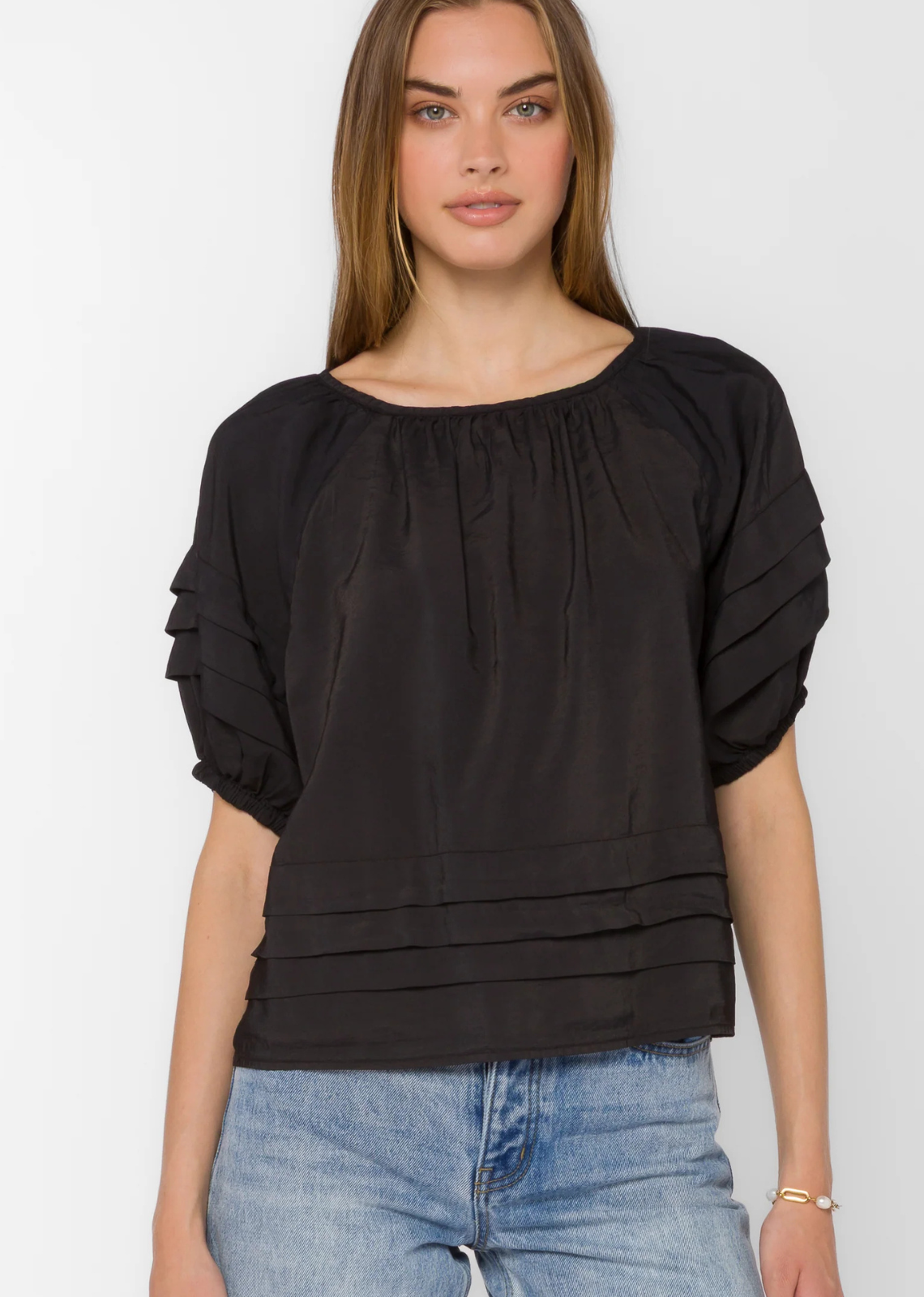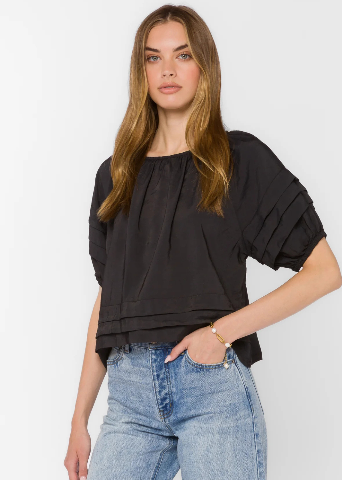 Description: This pop over silhouette features lightly puffed sleeves a soft pleat detailing, and a smooth fluid feel. Additional Information: Materials: 60% Cupro 40% Viscose...