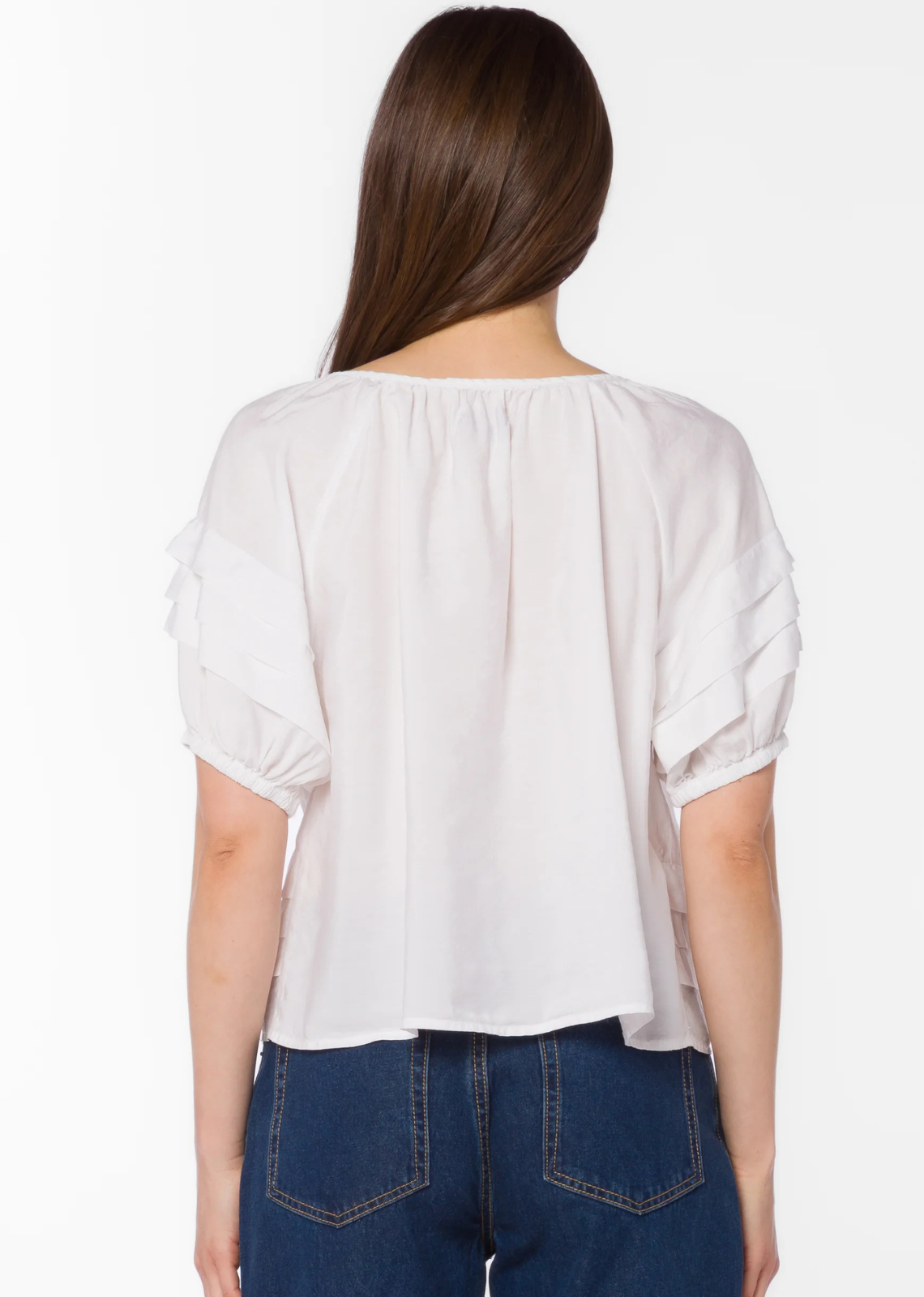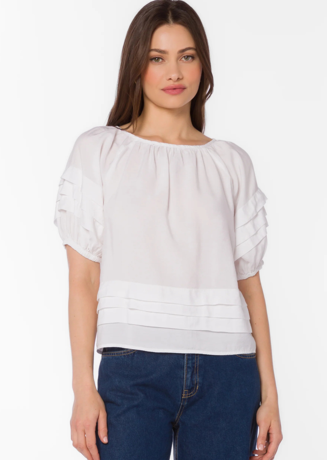 Description: Everyone needs a new white linen blouse for the new season! We are loving this blouse with pintuck detailing on the shoulders. Dress it...