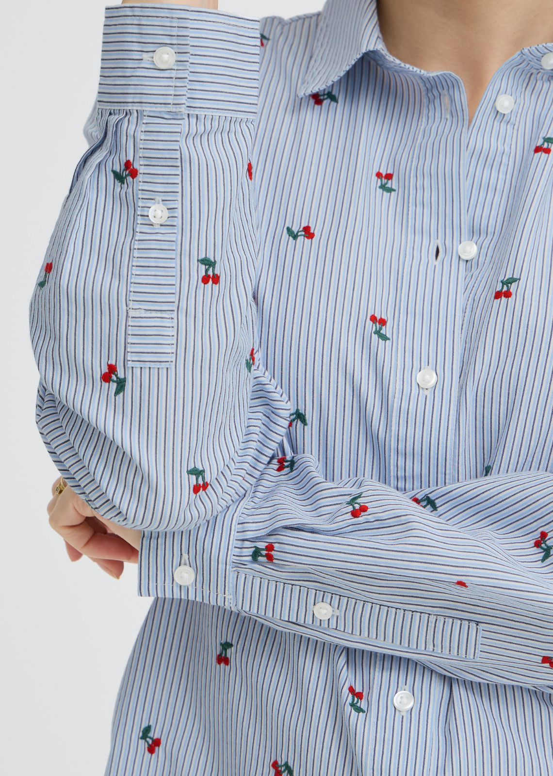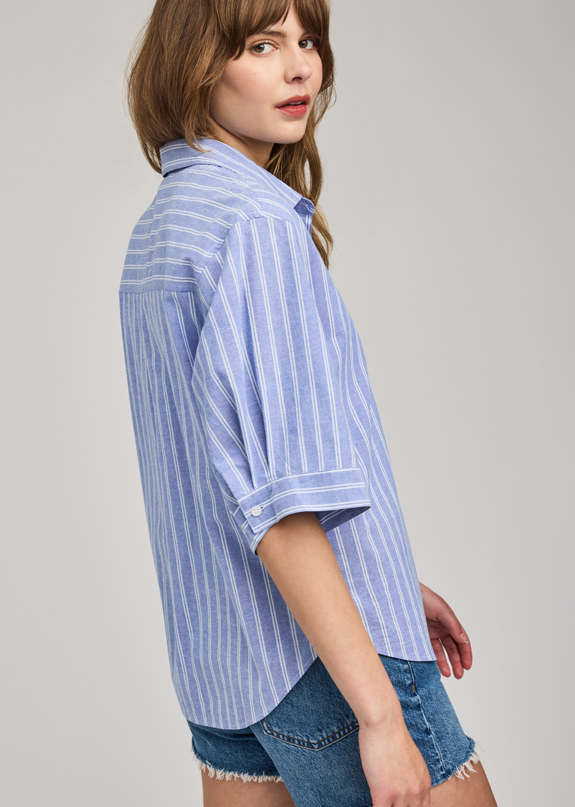 Description: The Blaire button down shirt is made of a cotton poplin with a yarn-dyed stripe. Features include a patch pocket and side slits. Complete...