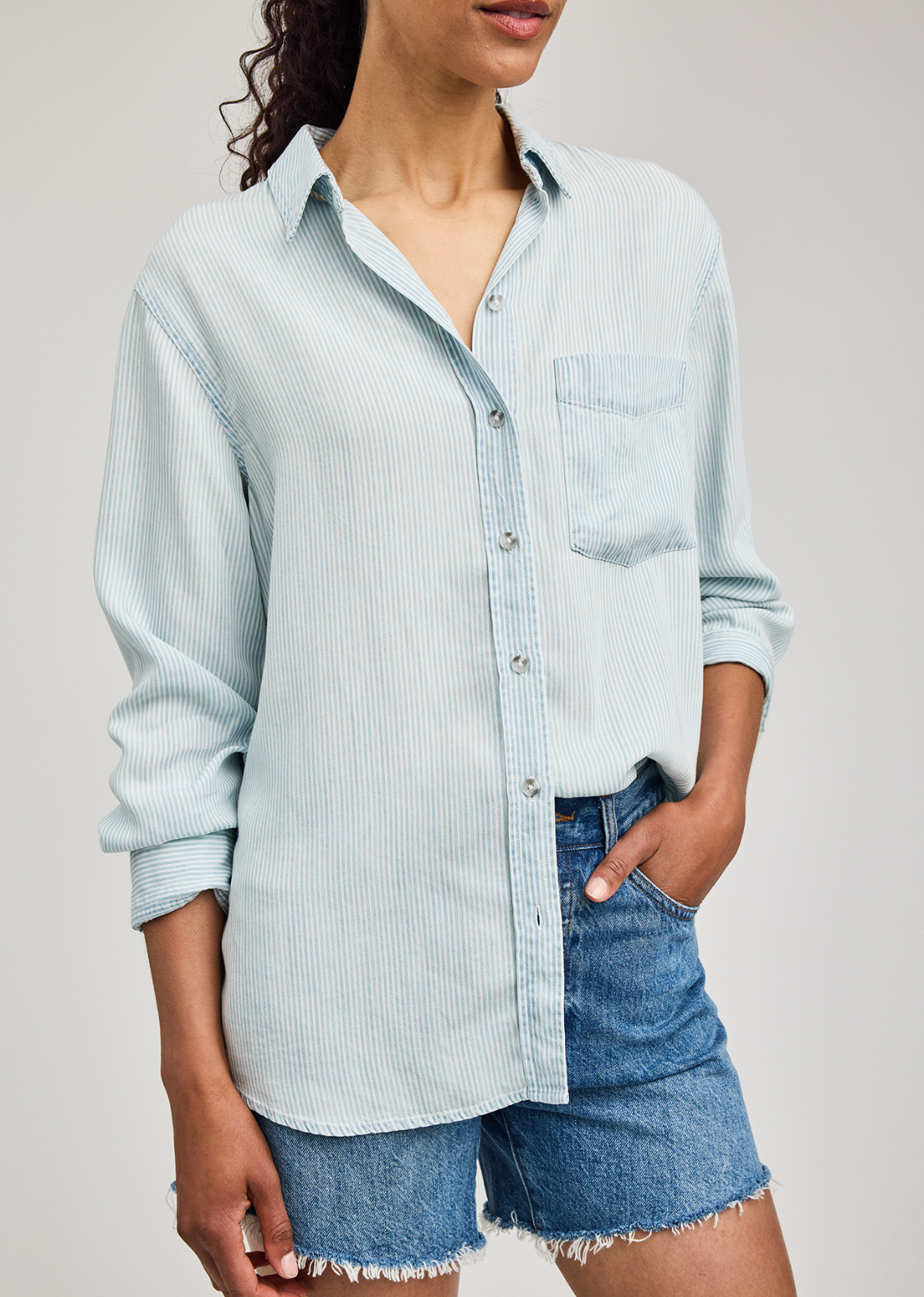 Description: Izzie Long Tencel Shirt is a modern styling staple - Luxe semi-sheer lyocell fabric makes for an elevated look. Full placket and elevated tailoring...
