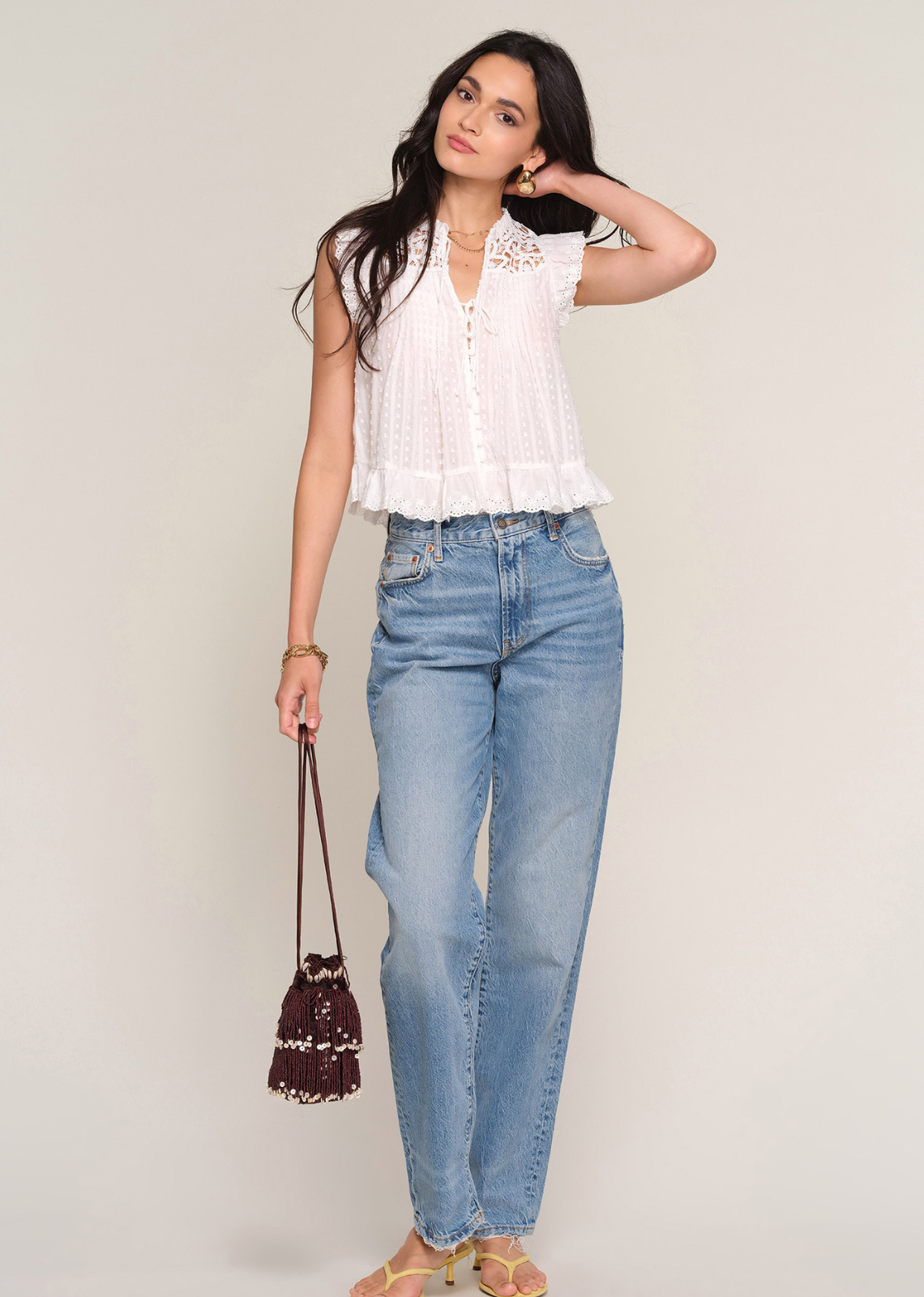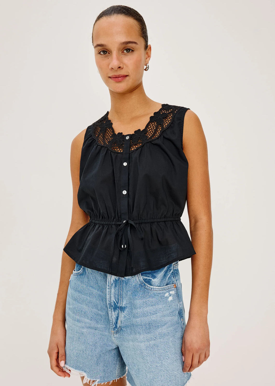 Description: The Leilani Top is crafted from lighweight, breezy beach cotton with a scoop neckline, lattice embroidery, front buttons, and a relaxed silhouette cinched at...