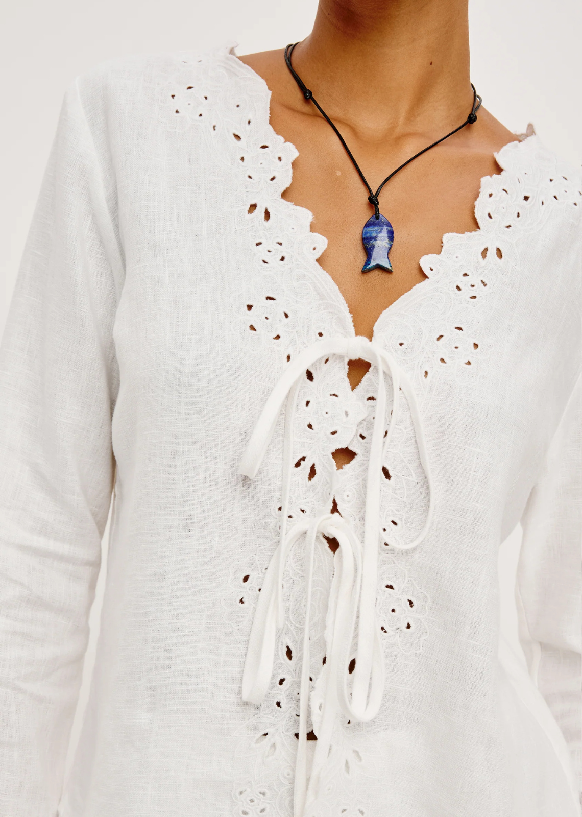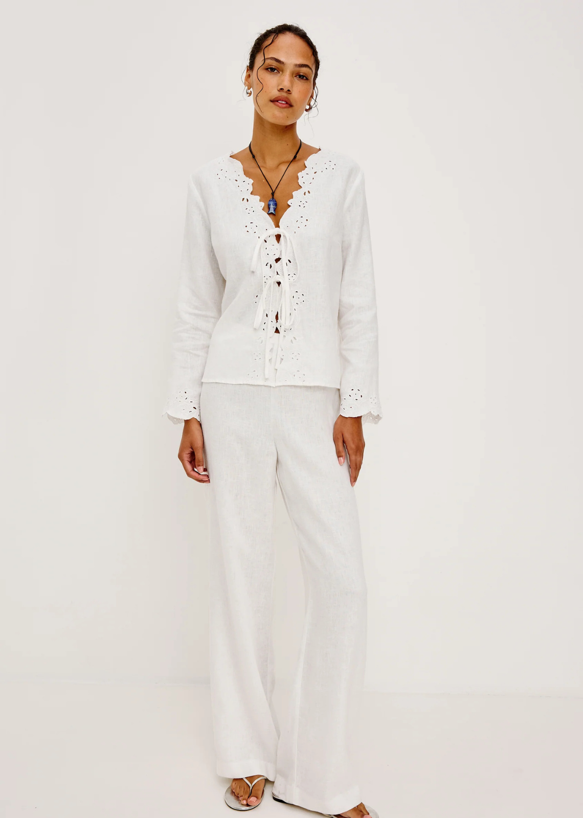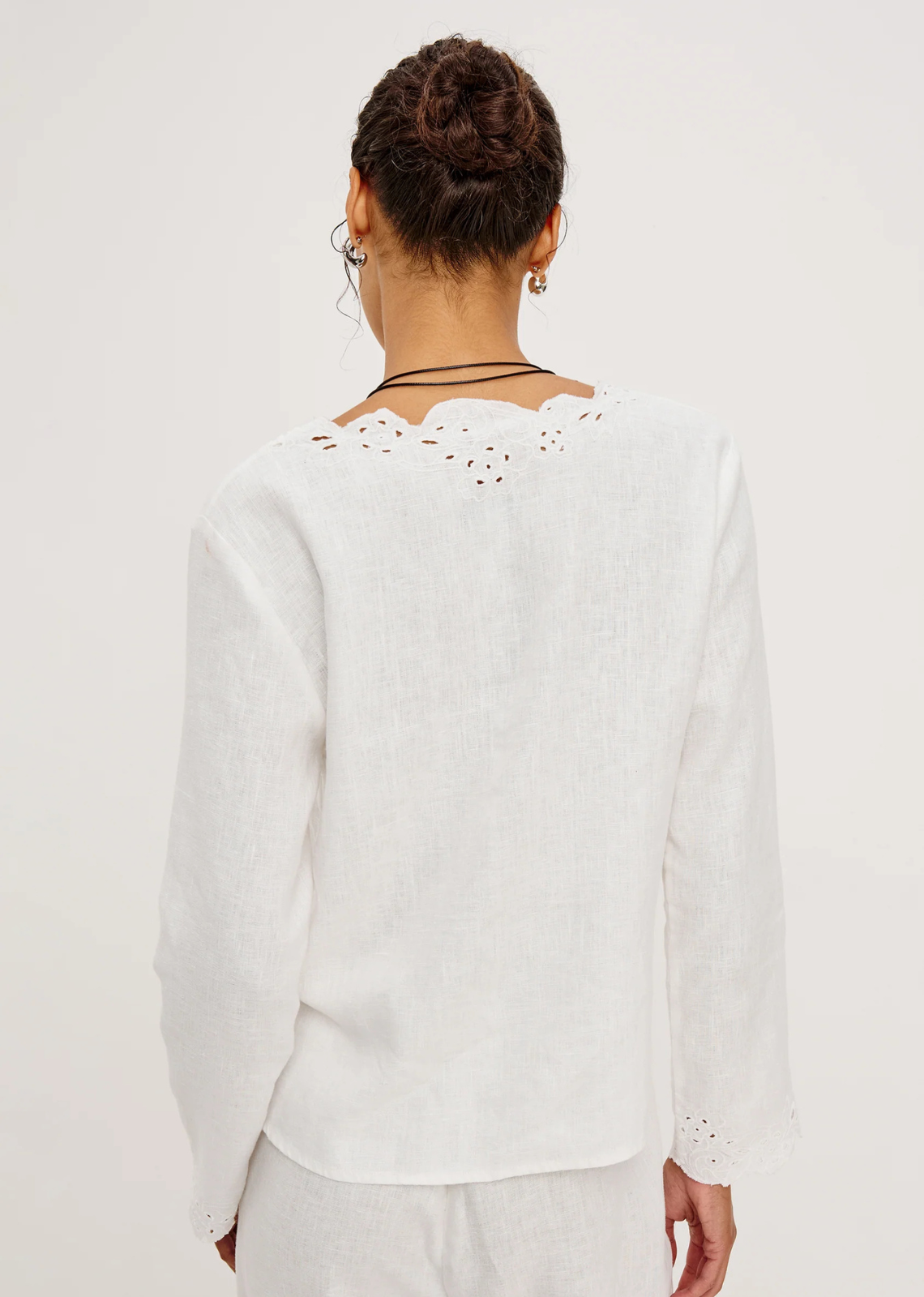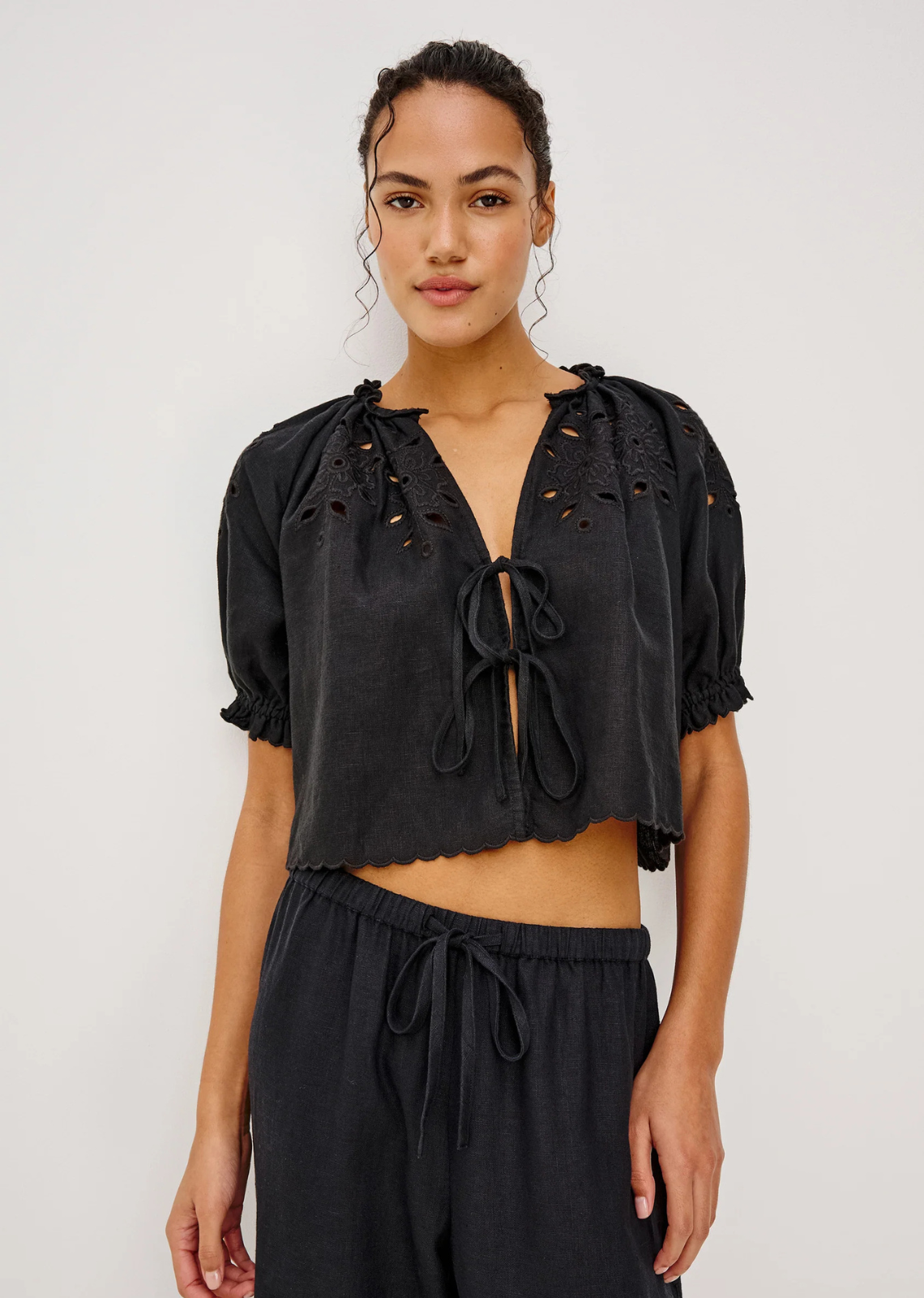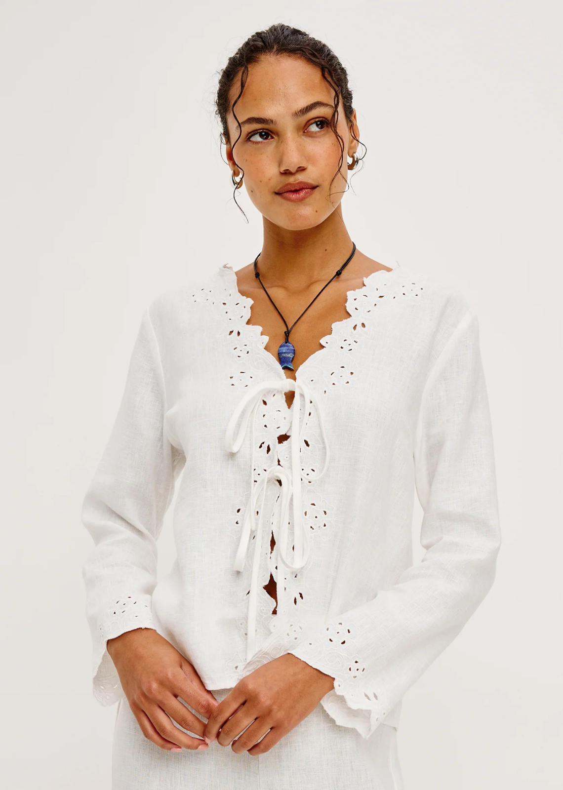 Description: The Fleur Top is crafted from luxe midweight linen, featuring delicate floral eyelet embroidery, an open front with adjustable self ties, long sleeves, and...