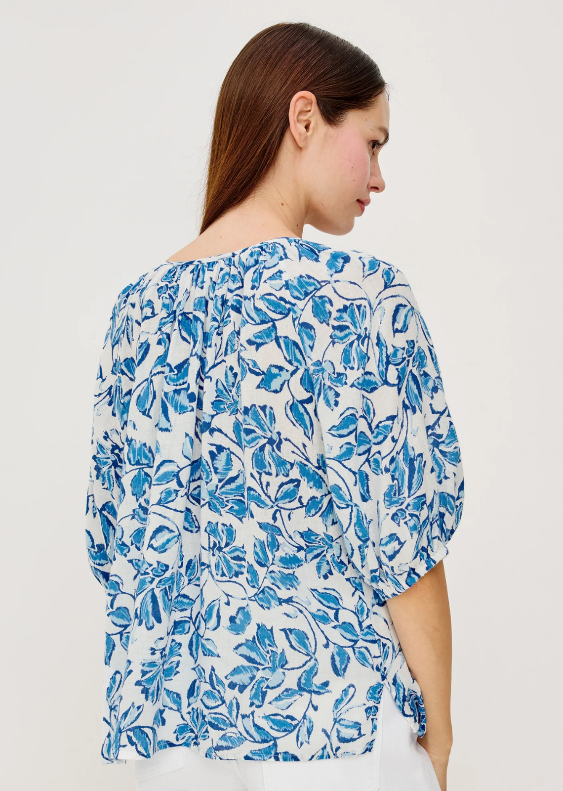 Description: Effortless half placket pop over shirt with single button closure. Elevated summer staple in beautiful blue shade with jacquard detailing. Team with denim or...
