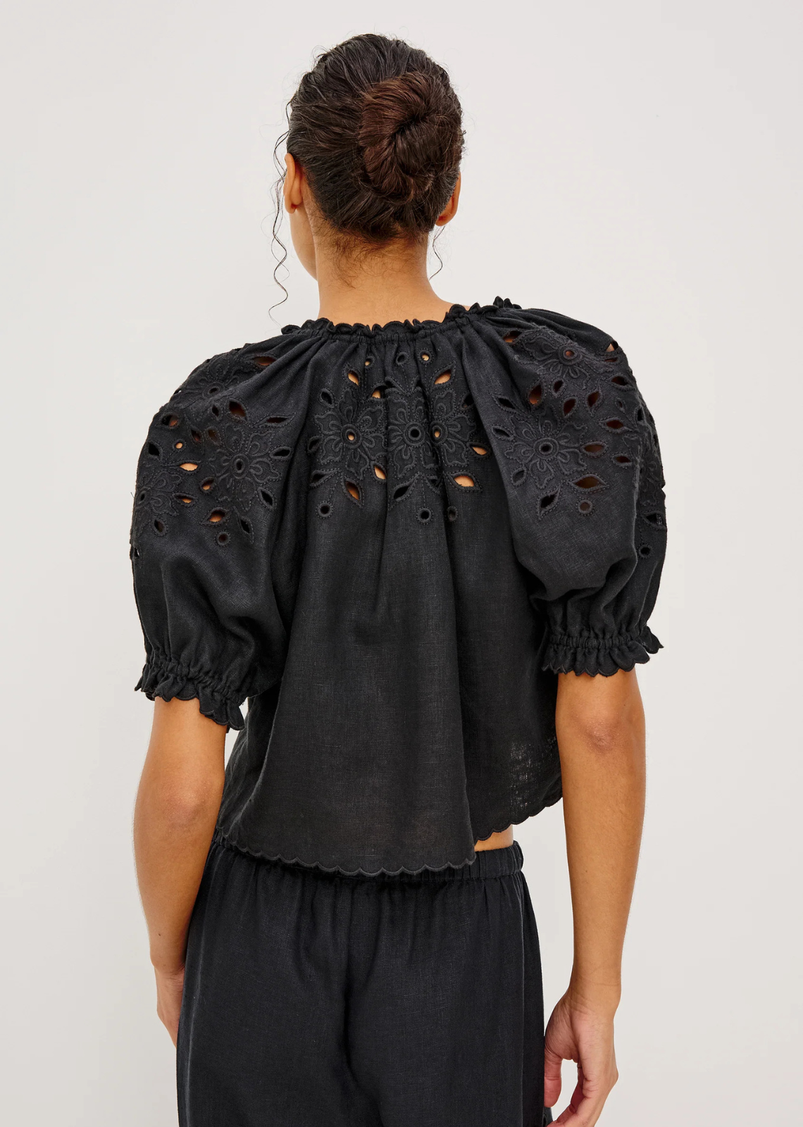 Description: A modern take on a milkmaid classic, the Lizabeth Top is crafted from luxe, weighty linen with delicate floral eyelet cutwork. It features a...