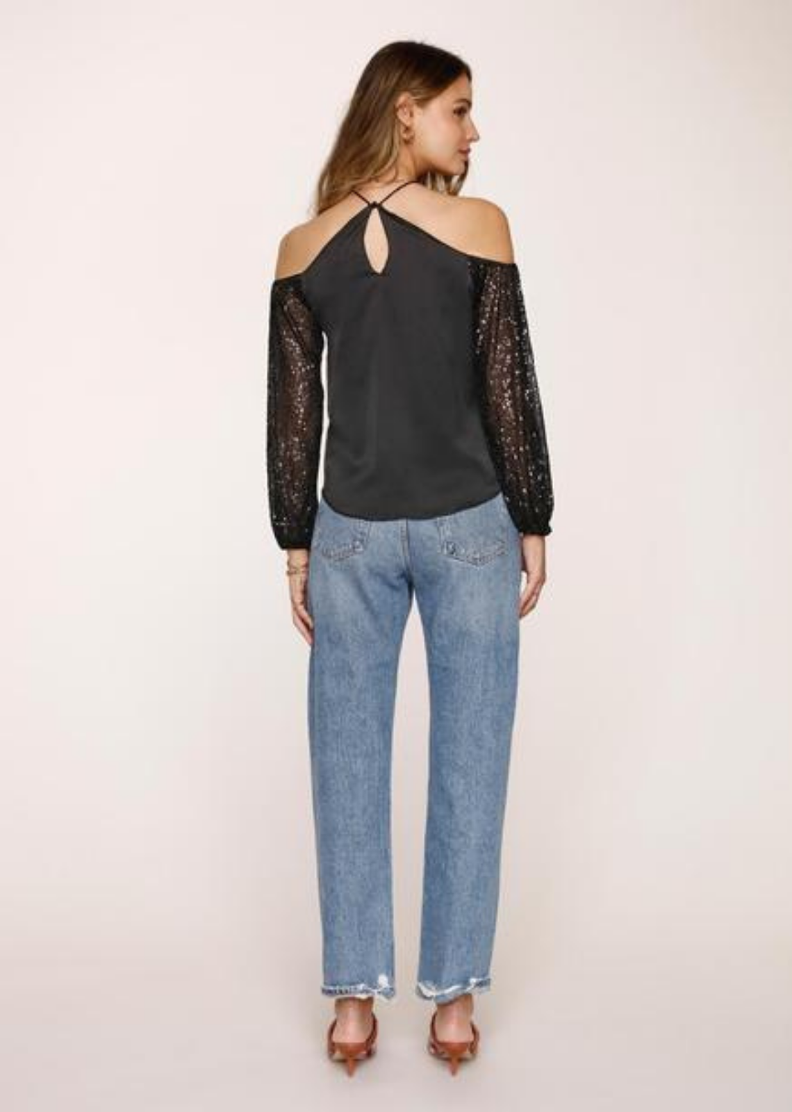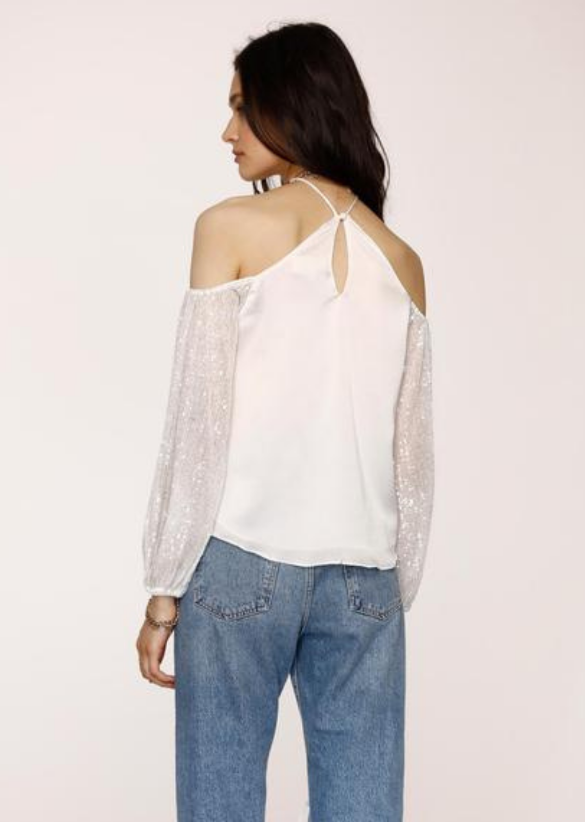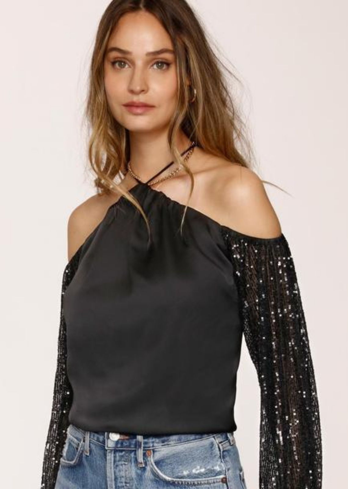 Description: Holiday ready. The Chase Top is perfectly constructed of hammered satin with sparkly sequined blouson sleeves. The halter neckline is perfect for showing just...