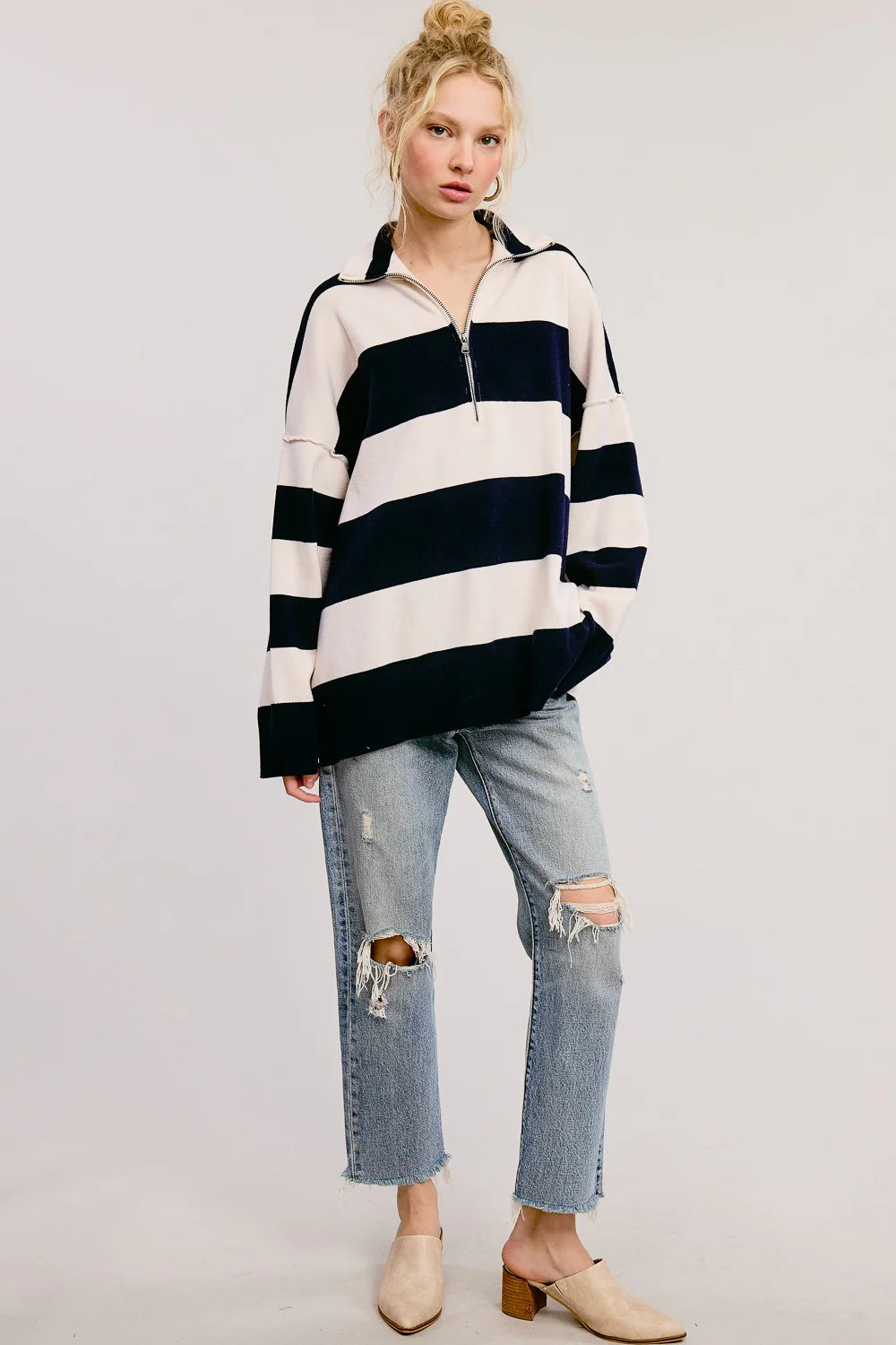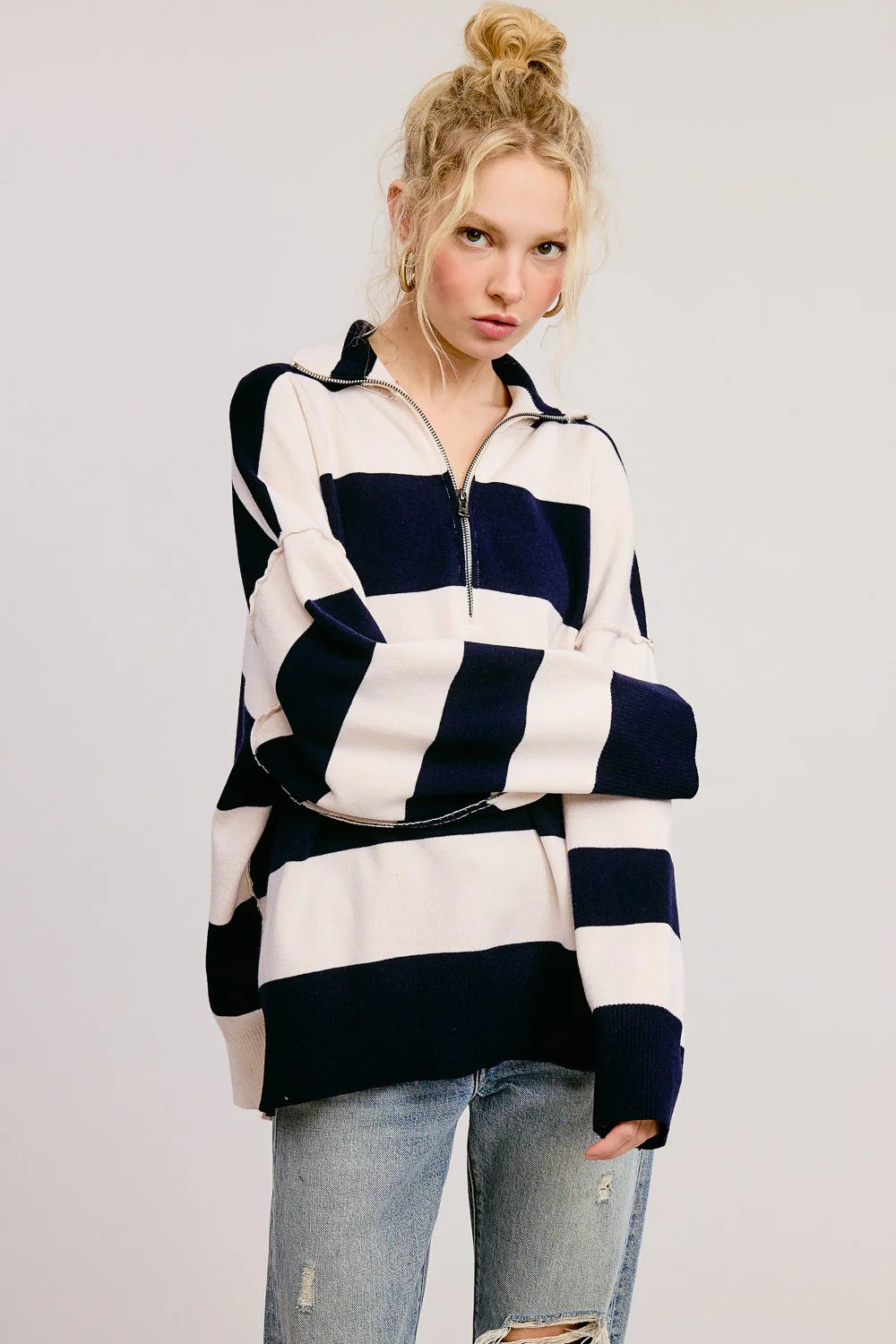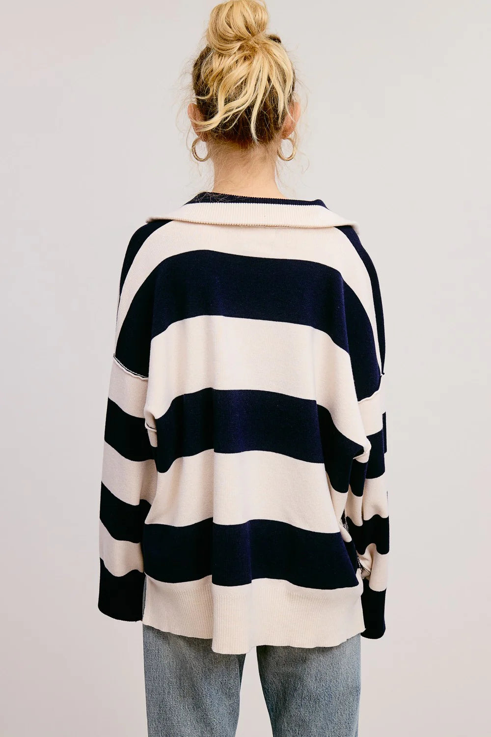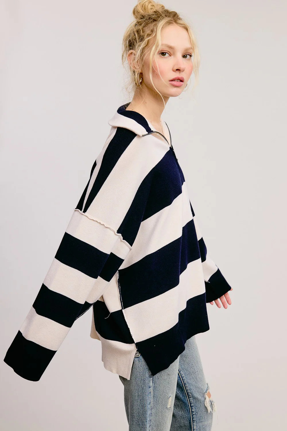 Description: The Drew Rugby Sweater is a classic, preppy knit featuring a traditional rugby-style collar and bold horizontal stripes. Crafted from soft, mid-weight for comfort...