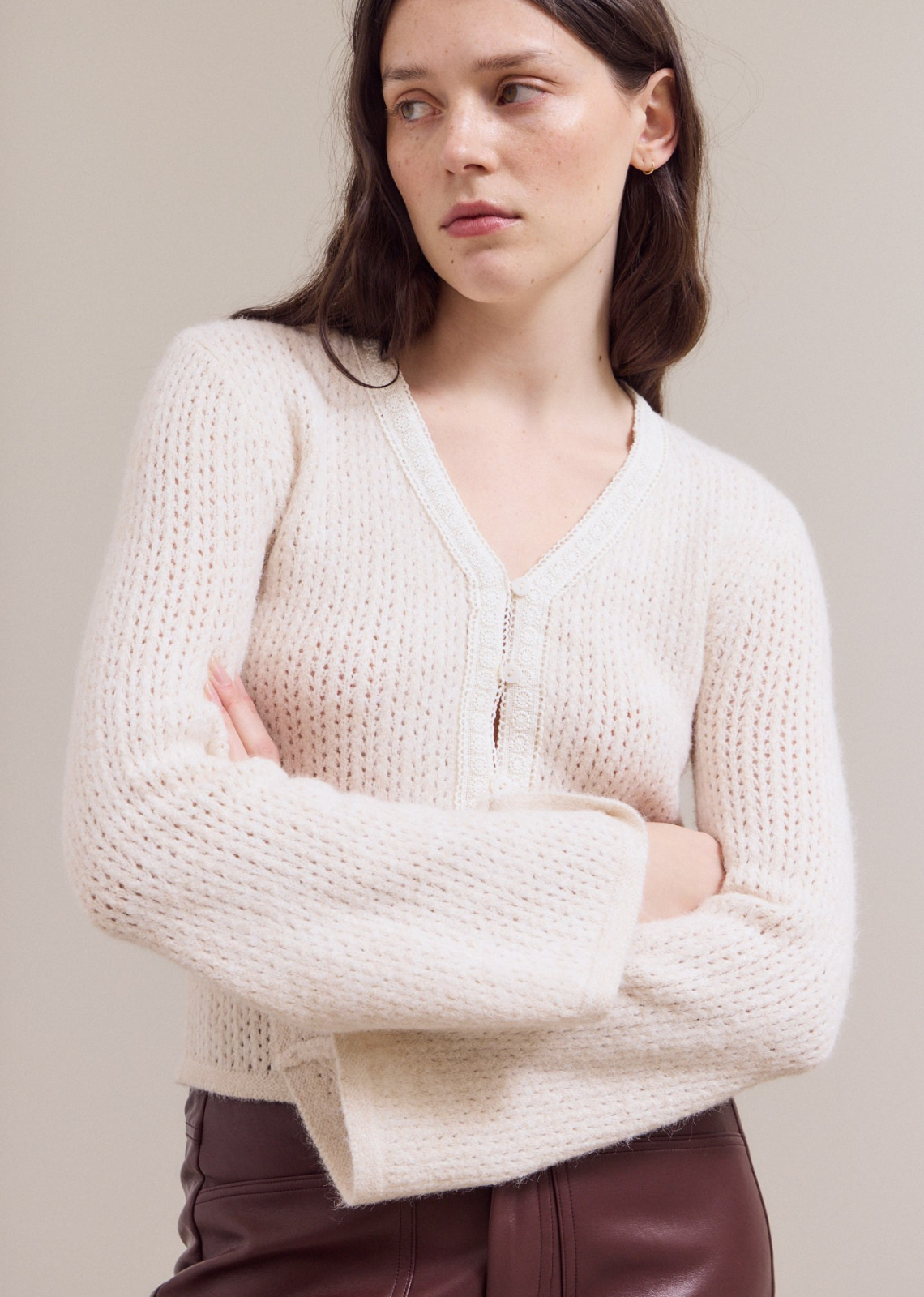 Description: Lace trim detailed cardigan. Additional Information: 82% Polyester 15% Acrylic 3% Spandex 80428