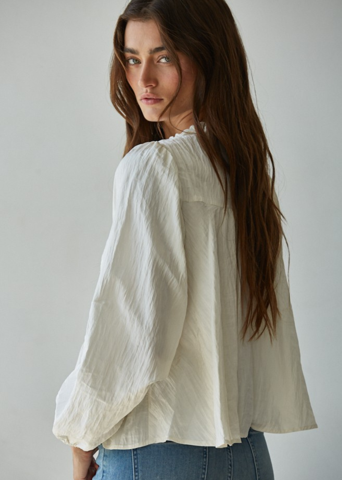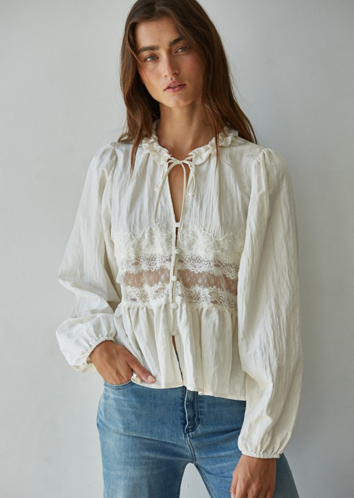 Description: Woven Polyester Nylon Sheer Lace Detail V-Neck with Ruffled Tied Ribbon Round Neck Long Sleeve Blouse Top With Front Button And Ruffled Peplum Additional...