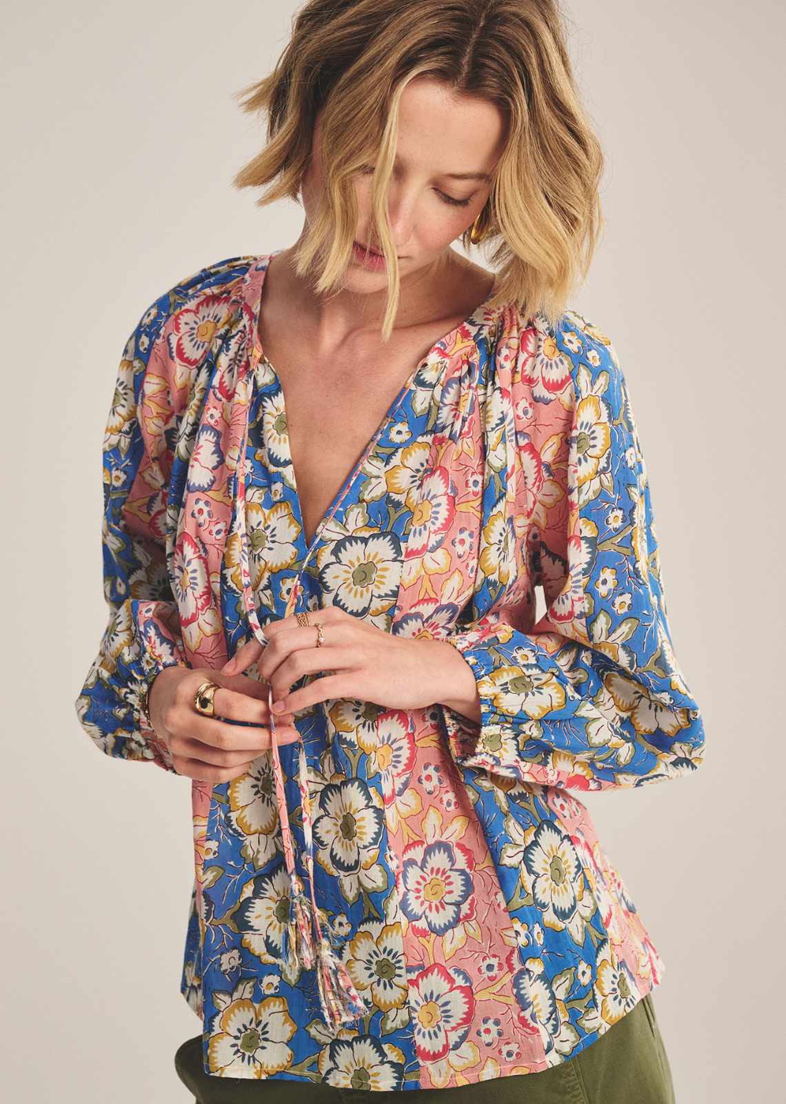 Description: Offering a relaxed, breezy fit, this top is crafted from lightweight printed cotton for all-day comfort. It features a V-neckline with front ties, puffed...